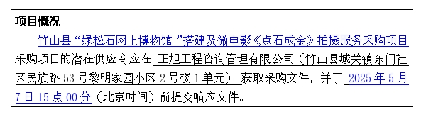 2、项目名称:“竹山县绿松石网上博物馆”搭建及微电影《点石成金》拍摄服务采购项目