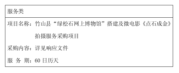 二、项目名称:竹山县“绿松石网上博物馆”搭建及微电影《点石成金》拍摄服务采购项目