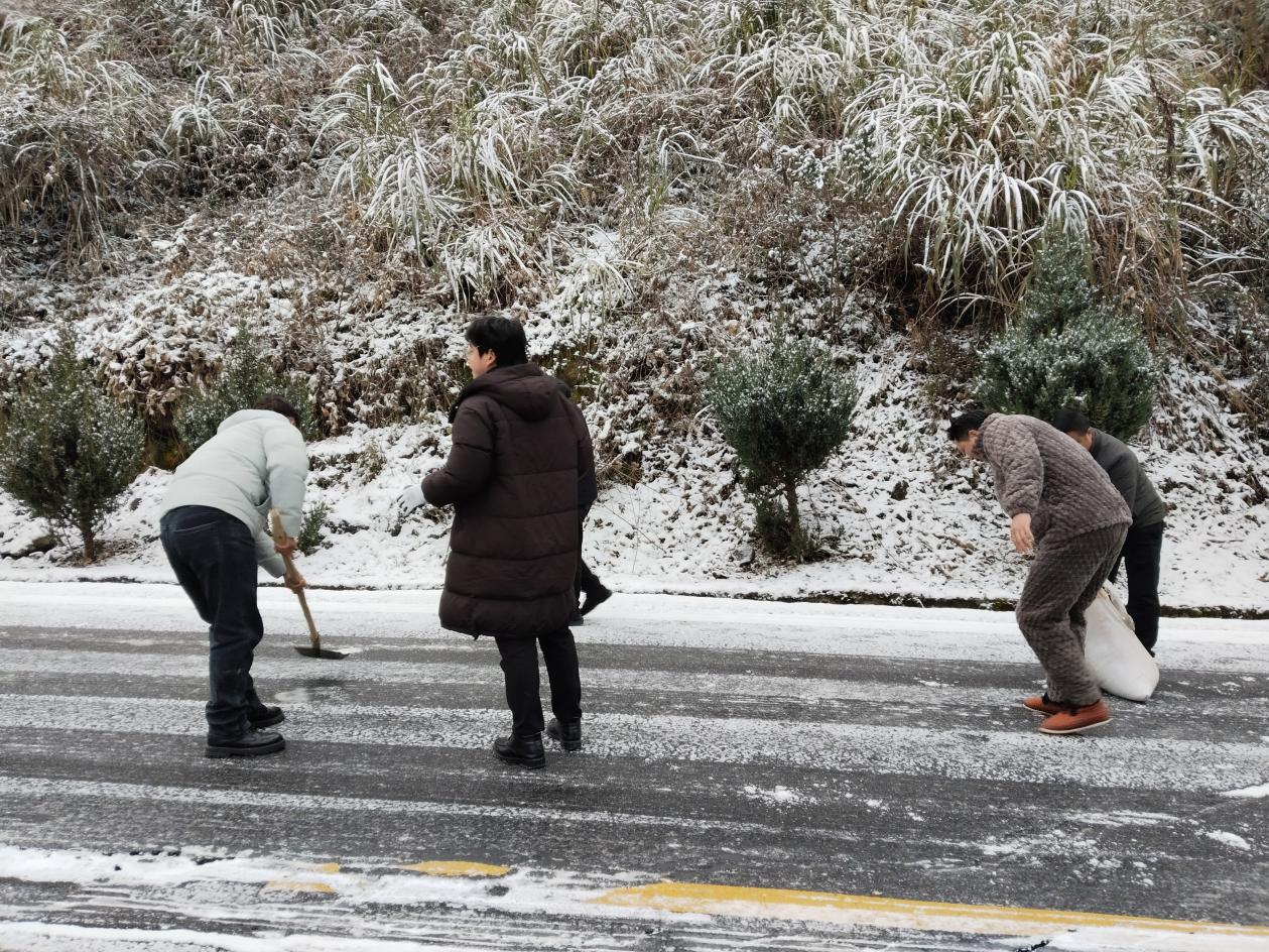 在交通保障方面,深河乡针对积雪结冰严重路段,对454省道深河乡路段、桥梁及急弯陡坡等易结冰区域实施重点管控。组织党员干部开展撒盐除冰作业,及时清除路面积雪;对不具备通行条件的道路,采取交通管制措施并引导车辆分流,全力保障主干道路安全畅通与行车安全。
