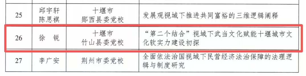 今日竹山网消息 近日,全省党校(行政学院)系统学习贯彻党的二十届四中全会精神理论研讨会优秀论文入选名单公布,县委党校3篇论文入选,分别是徐锐老师的《“第二个结合”视域下武当文化赋能十堰城市文化软实力建设初探》、覃祥渝老师的《“十五五”时期打造法治化营商环境的逻辑、原则与进路》、谢非老师的《“投资于人”理念下企事业单位高层次引进人才评价机制研究》,入选数量居全省县(市、区)委党校首位。