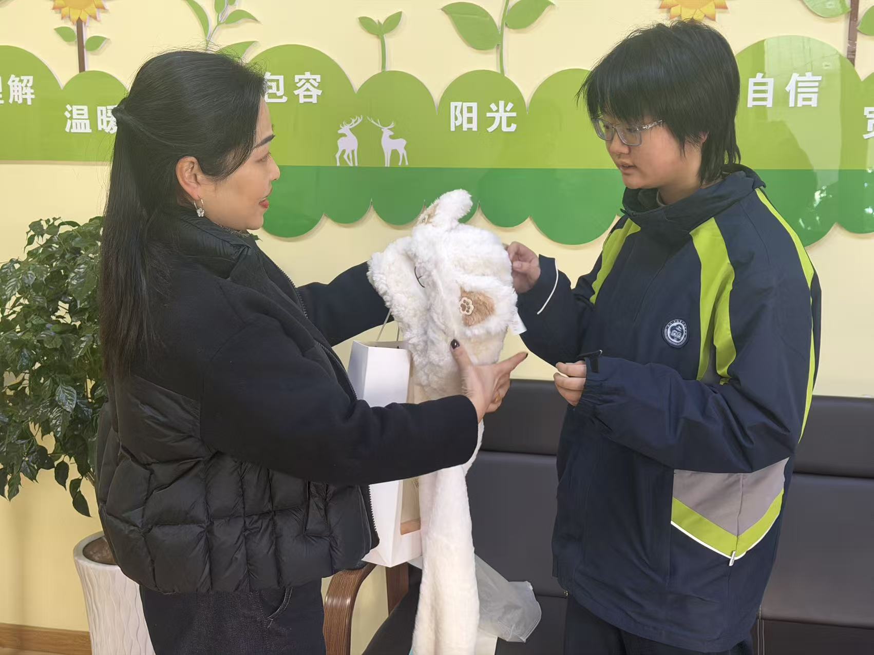 活动现场,蔡院长、张主任等爱心妈妈们亲手为孩子们系上柔软的围巾,细致的叮嘱里满是牵挂。她们还为孩子们递上精心挑选的书籍,涵盖中外名著、科普读物等,鼓励孩子们多读书、读好书,在知识的海洋中茁壮成长。孩子们捧着礼物,脸上洋溢着灿烂的笑容,一声声真挚的“谢谢”温暖了在场每个人。