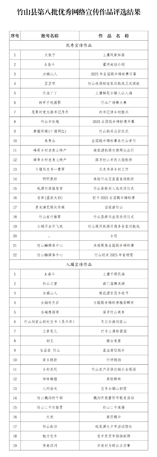 根据竹山县第八批优秀网络宣传作品评选工作安排,经公开征集、联合评审等环节,已评出优秀宣传作品22件、入围宣传作品19件,现将结果予以公示。公示期为2026年1月23日至1月30日,如有异议,请在公示期内反馈意见,联系电话:0719-4225770。