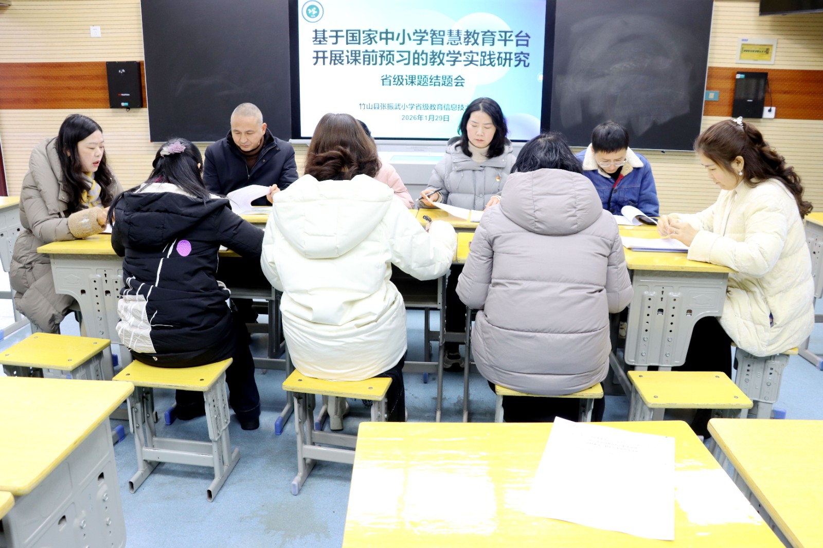 今日竹山网消息 1月29日,张振武小学召开省级教育信息技术课题《基于国家中小学智慧教育平台开展课前预习的教学实践研究》结题推进会。