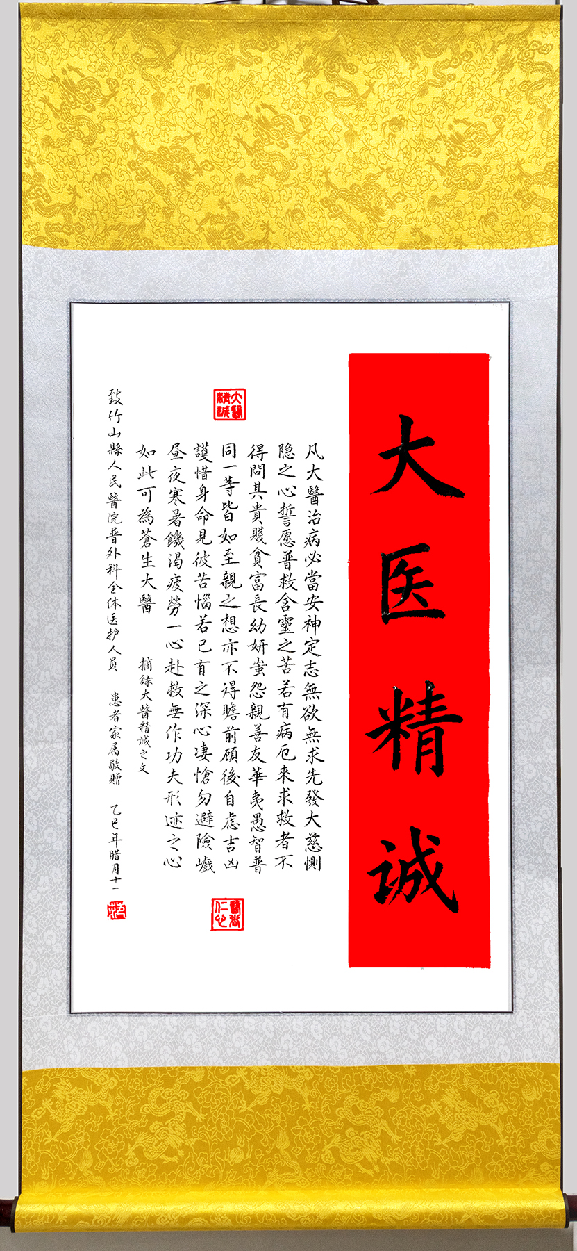这幅书法作品以唐代孙思邈《大医精诚》为内容,红底黑字的“大医精诚”四个楷体大字端庄醒目,旁边工整地抄写着这部医学经典的核心内容。作品既是对普外科医护团队精湛医术的认可,更是对他们“大慈恻隐、不避苦劳”高尚医德的生动赞誉。