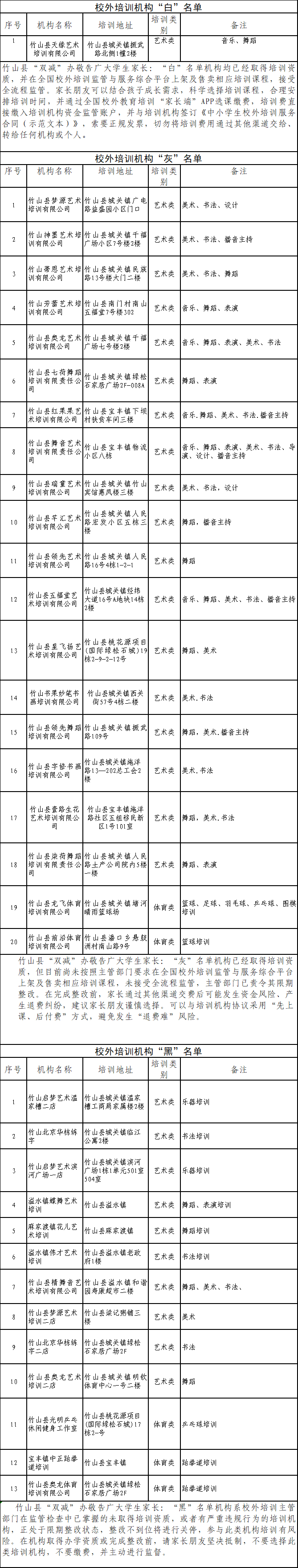 附:竹山县校外培训机构“白、灰、黑”名单