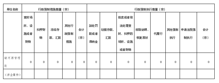 说明:1.“行政强制措施实施数量”的统计范围为统计年度1月1日至12月31日期间作出的表格所列各类行政强制措施决定的数量。2.“行政强制执行实施数量”的统计范围为统计年度1月1日至12月31日期间表格所列各类行政强制执行完毕或者终结执行的数量。3.“申请法院强制执行”数量的统计范围为统计年度1月1日至12月31日期间向法院申请强制执行的数量,时间以申请日期为准。4.涉企案件填入第二行单独分行统计。