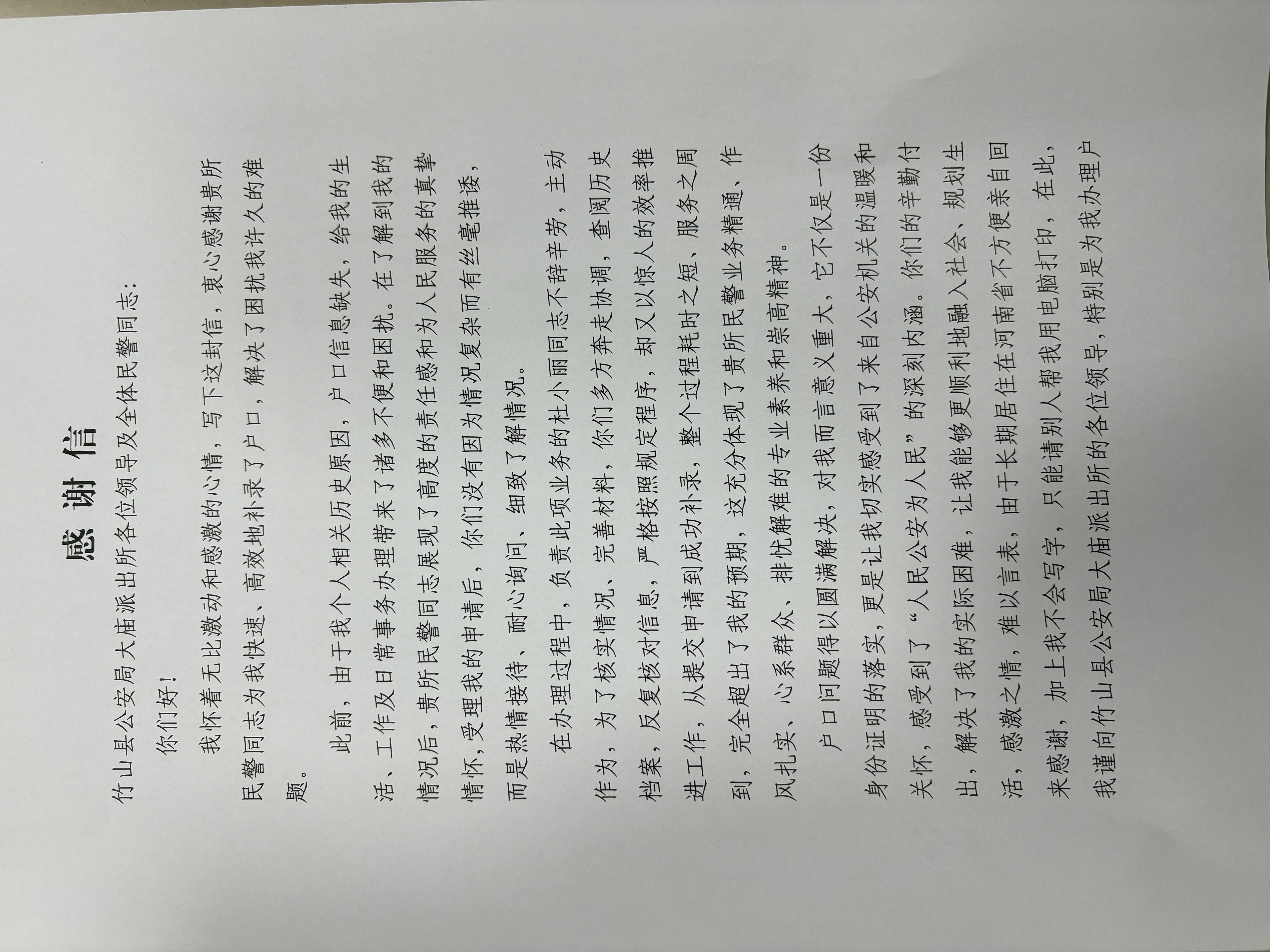 当所有手续办理完毕,民警将打印好的崭新户口簿,通过可靠途径送达黄某芳手中。至此,困扰她三十多年的户口难题终于画上句号,这意味着,她终于可以正常申领居民身份证,享受国家各项惠民政策,法律意义上的权利和义务得到全面保障。“真的太感谢你们了,我终于‘有身份’了!”黄某芳的感激之情溢于言表。一面寄托着谢意的感谢信,也从河南寄到了大庙派出所。
