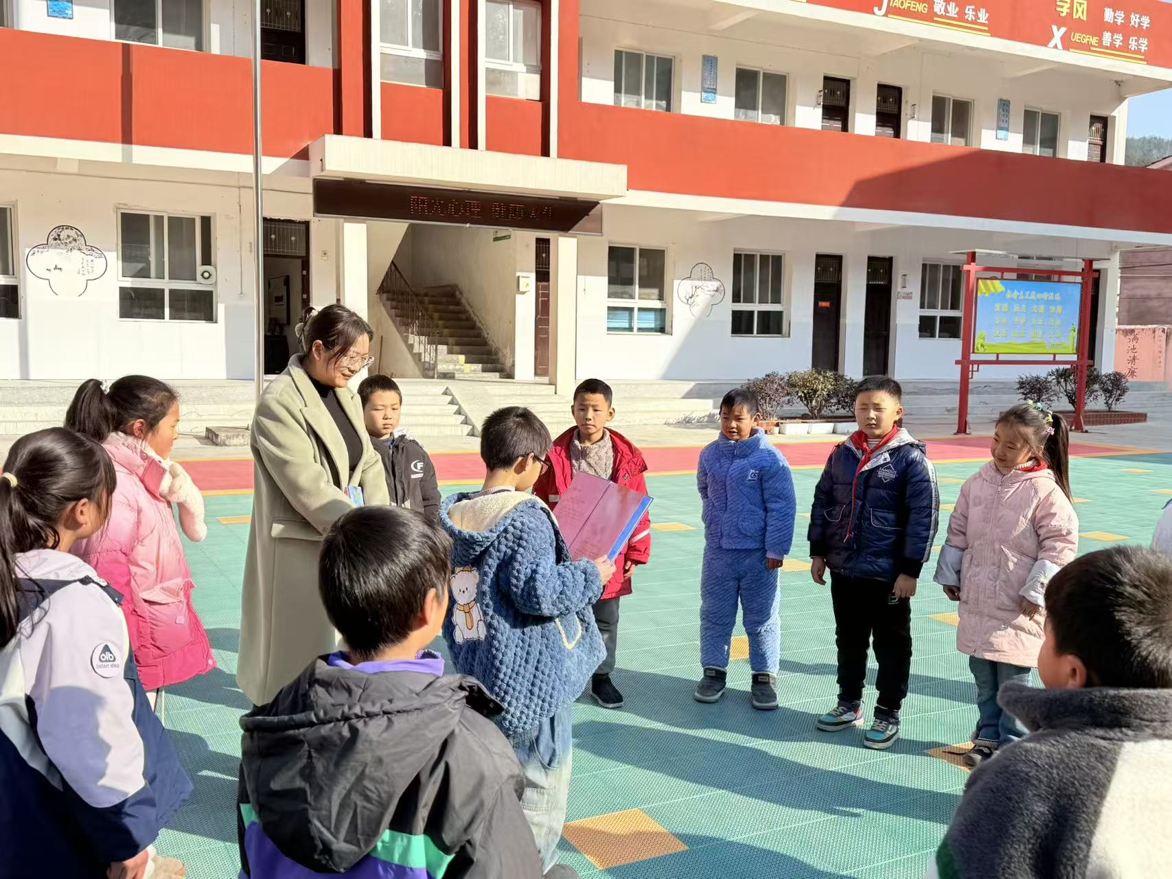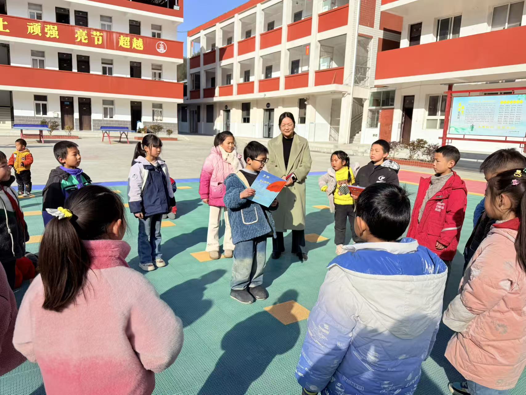 活动中,二十余名儿童在操场围坐,聆听童伴妈妈讲解绘本故事。该书讲述了小女孩露露在放学后拒绝跟随陌生人离开的经历。孩子们在听讲过程中专注认真。随后的延伸环节包括绘画和情景表演。绘画组孩子描绘了故事中的安全场景或自己与家人的安全约定;表演组孩子则现场演绎故事情节,用表演展现应对陌生人的方法。活动结束时,童伴妈妈为参与儿童颁发了“安全小卫士”纪念品。