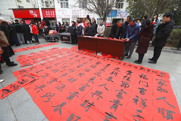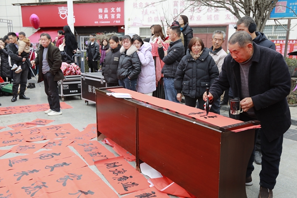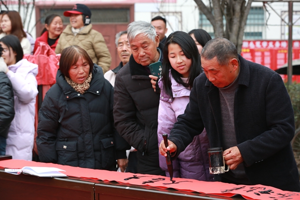 书写现场,退休教师们凝神聚气,挥毫泼墨。楷书工整端庄,行书流畅生动,隶书古朴典雅。围观的群众或静静欣赏,或轻声念诵联句内容,不时发出赞叹。“老师们的字写得真好!这比买的印刷春联更有味道、更有感情!”捧着墨迹未干、寓意吉祥的春联,村民张大爷笑容满面。