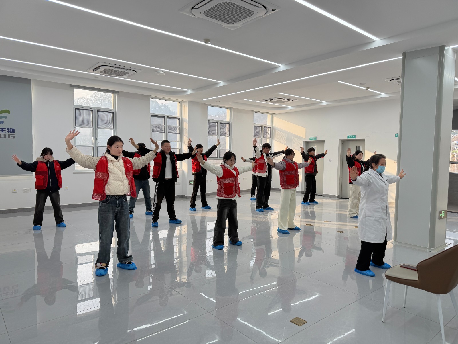 今日竹山网消息 2月10日上午,竹山血浆站活动室内,随着悠扬的古乐响起,十余名青年志愿者在血浆站胡医生的指导下,缓缓舒展身姿,正式开启为期五天的八段锦公益教学之旅。