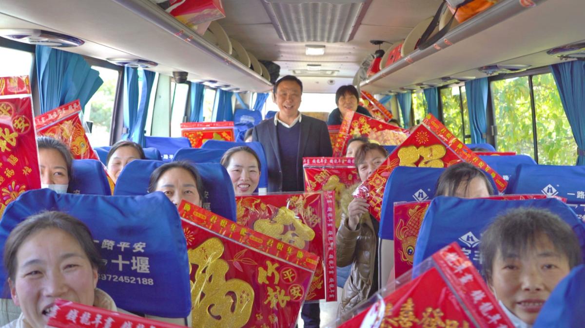 活动现场,客车整齐列队,工作人员为返乡职工送上精心准备过年大礼包和春联、福贴。返乡务工人员有序登车,在温馨暖意中踏上返乡路。
