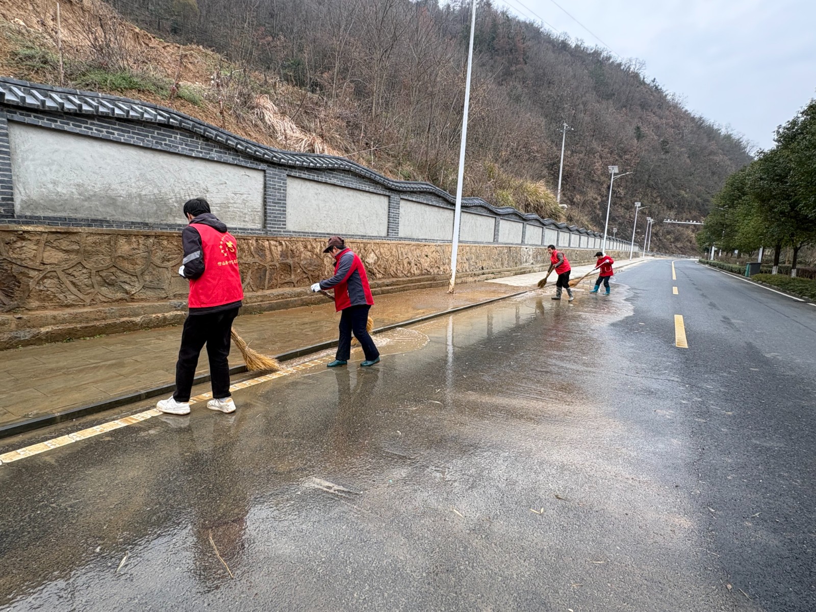 行动中,深河乡联合乡新时代文明实践所、深河村组建清洁队伍,制定清洗方案。现场可见,红色的洒水车缓缓行驶在集镇主干道上,高压水枪喷出的水流精准冲刷着路面的淤泥、落叶和积尘;身着红马甲的志愿者们手持扫帚、铁锹,分工协作、配合默契,对路面积水、顽固污渍及卫生死角进行细致清扫。