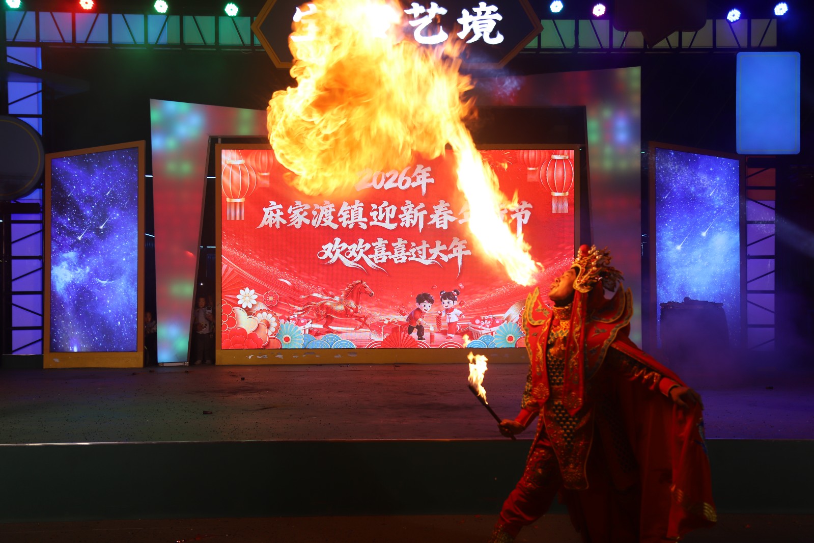 夜幕降临,灯光璀璨,文艺汇演精彩上演。舞蹈《策马奔腾》气势恢宏,铿锵有力,展现出麻家渡镇奋勇争先、昂扬向上的精神风貌;魔术表演变幻莫测,现场惊喜不断;《你是我的小苹果》舞蹈欢快活泼,氛围热烈;歌曲《来跳舞》动感十足,带动全场共鸣;非遗打铁花,场面震撼壮观;七彩祥云烟花秀璀璨绽放,点亮夜空;国风舞蹈温婉典雅,尽显传统美学;川剧变脸绝活精湛,引得阵阵喝彩;喷火表演气势十足,将气氛推向高潮;舞蹈《APT》青春动感,活力四射。最后一场热闹的篝火舞,让群众围着篝火载歌载舞,尽情释放欢乐,共度美好夜晚。