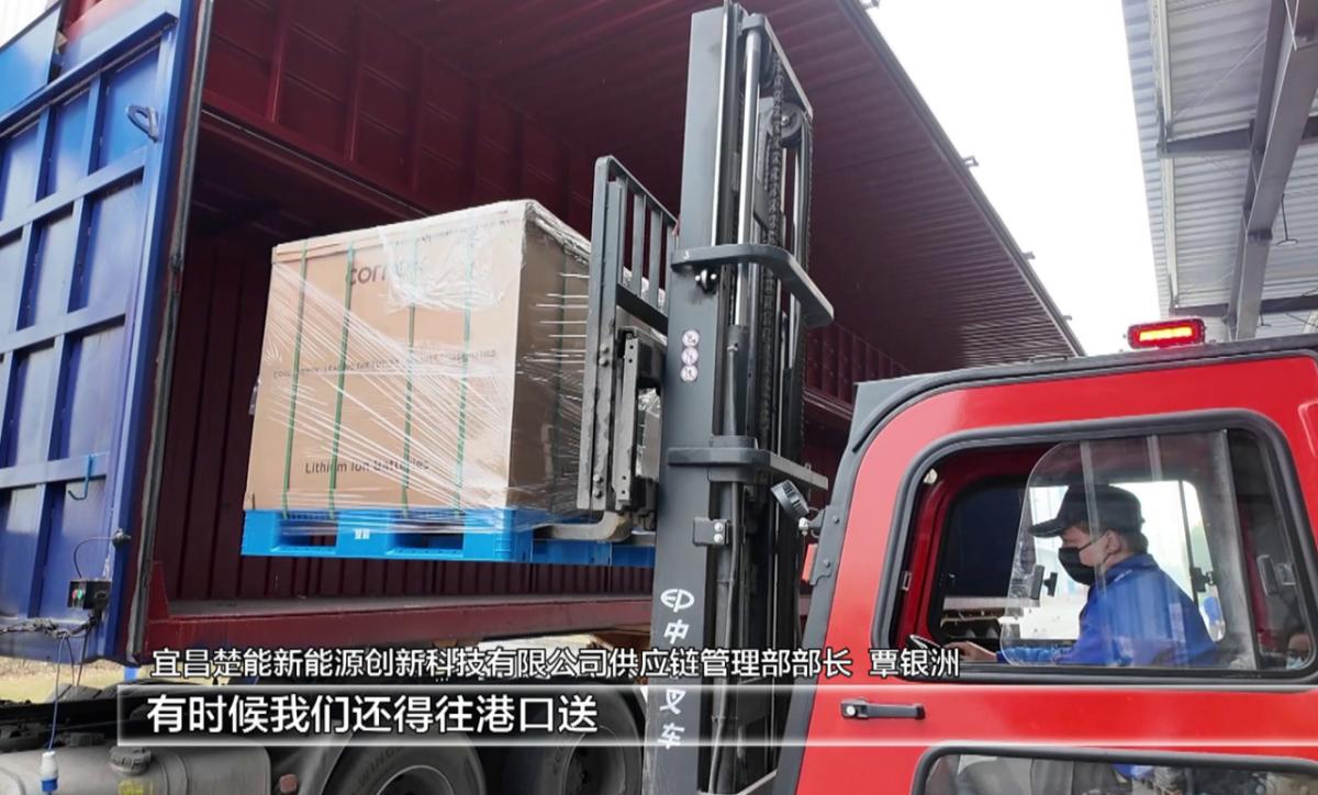 上午9点,楚能新能源宜昌基地发货平台,十多辆重型卡车首尾相接。一辆辆叉车往返于卡车与平台间,将蓝色托架上的储能电池整齐放入车厢。