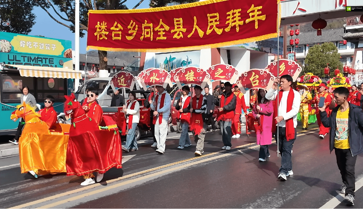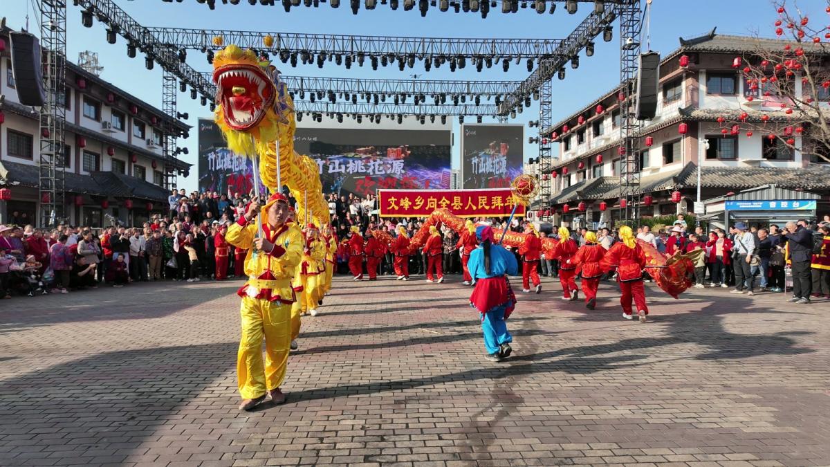 下午两点半,四个乡镇的巡游队伍沿桃花源街区巡演,浩浩荡荡的队伍宛若游龙,队员们精神抖擞,沿途群众纷纷驻足喝彩,年味在街巷间流淌。