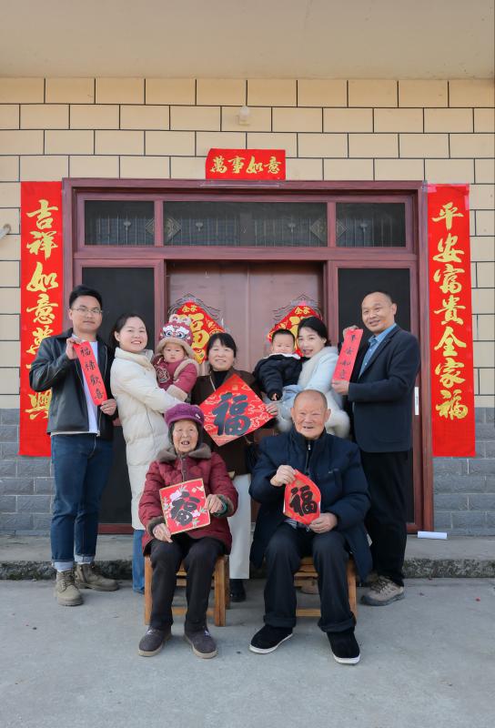 寒暄过后,我以门前“平安富贵全家福,吉祥如意万事兴”的对联和福字作背景,为他们拍摄全家福。在引导他们摆造型时,宠物狗也跑过来凑热闹,绕着我双腿磨蹭,不住地对我摇头晃脑跟我套近呼,仿佛也在祝我新年快乐!