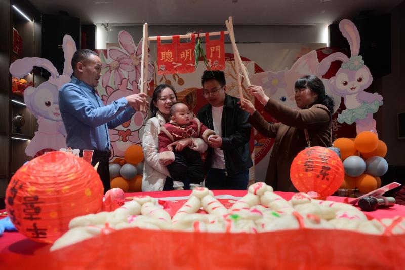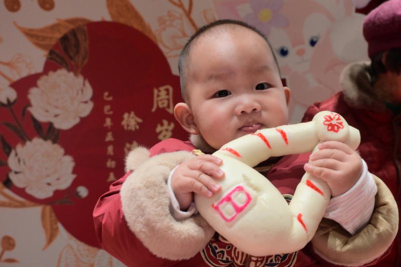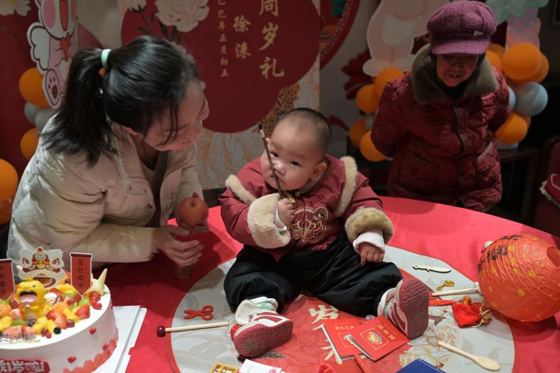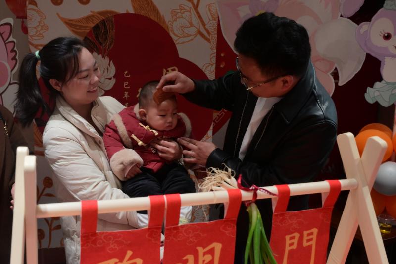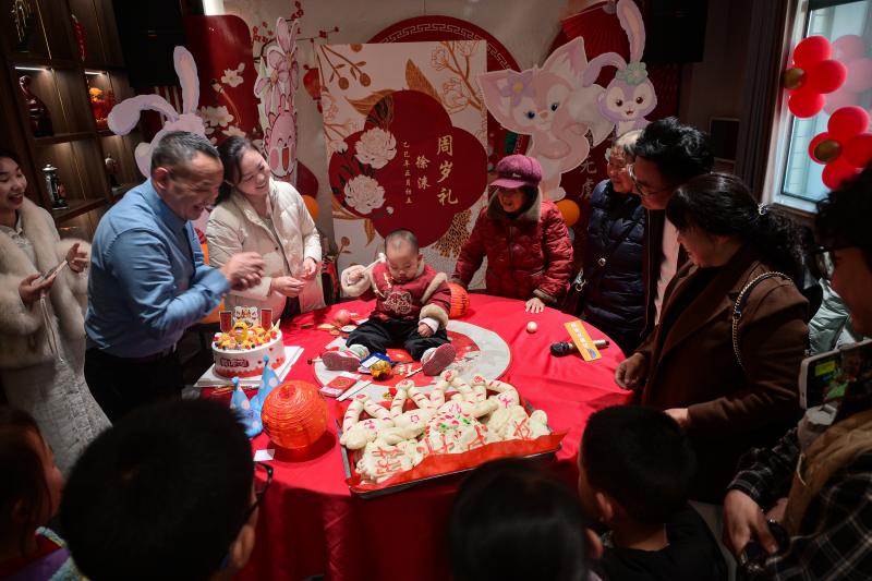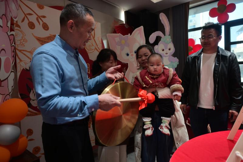 在红布铺就的桌子上。“吉时到——”随着一声锣敲响,金牌主持梦梦宣布抓周开始。她靓丽的外表、流利的普通话、娴熟的主持技巧,让抓周仪式显得既庄重又亲切,既严肃又活泼,从洗手、梳头、过“聪明门”,到正式抓周,再到吃长寿面、分蛋糕,整个仪式如行云流水,一气呵成,赢得观众阵阵掌声与喝彩声。