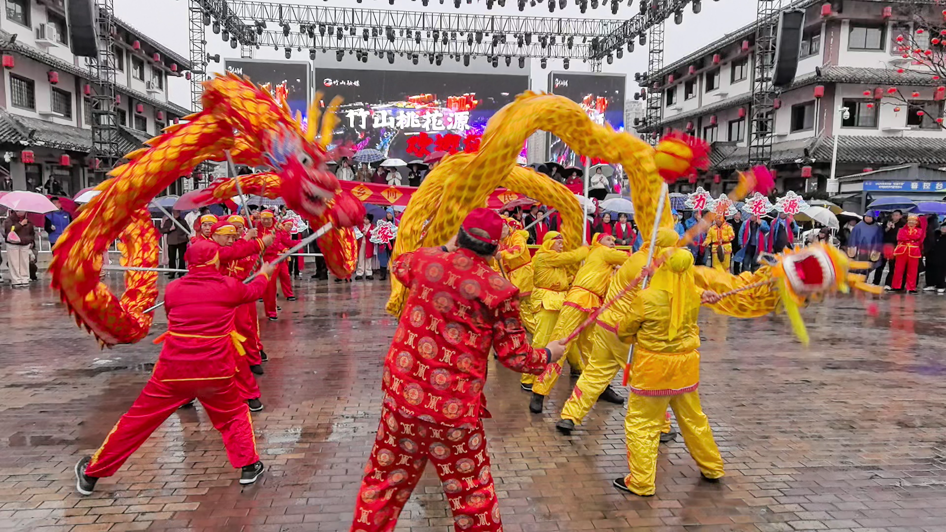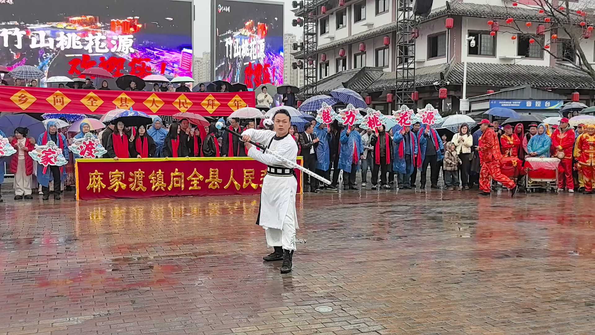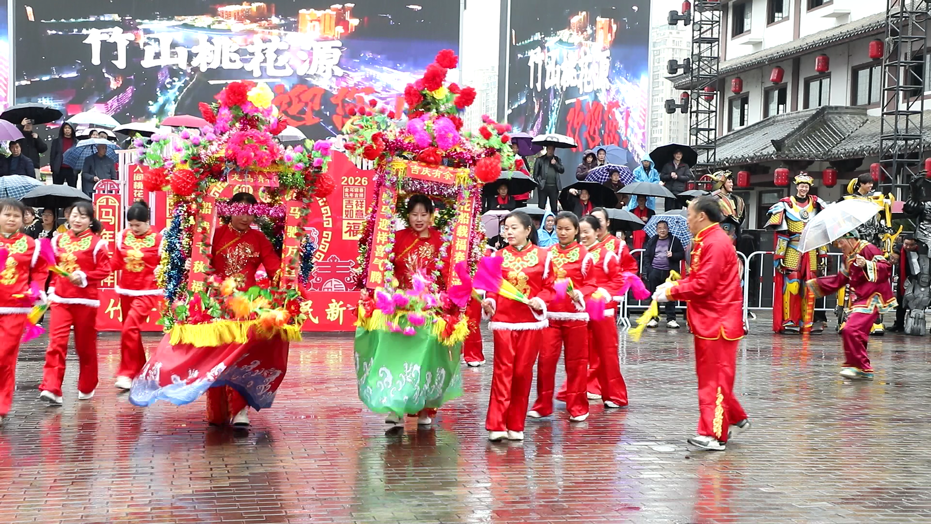 今日竹山网消息 2月23日是农历正月初七,竹山县城细雨绵绵,却丝毫挡不住人们对新春佳节的喜庆热潮。竹坪乡、大庙乡、麻家渡镇、深河乡四支民俗展演队伍冒雨上演了一场独具特色的民俗巡演,为市民送上别样的马年祝福。