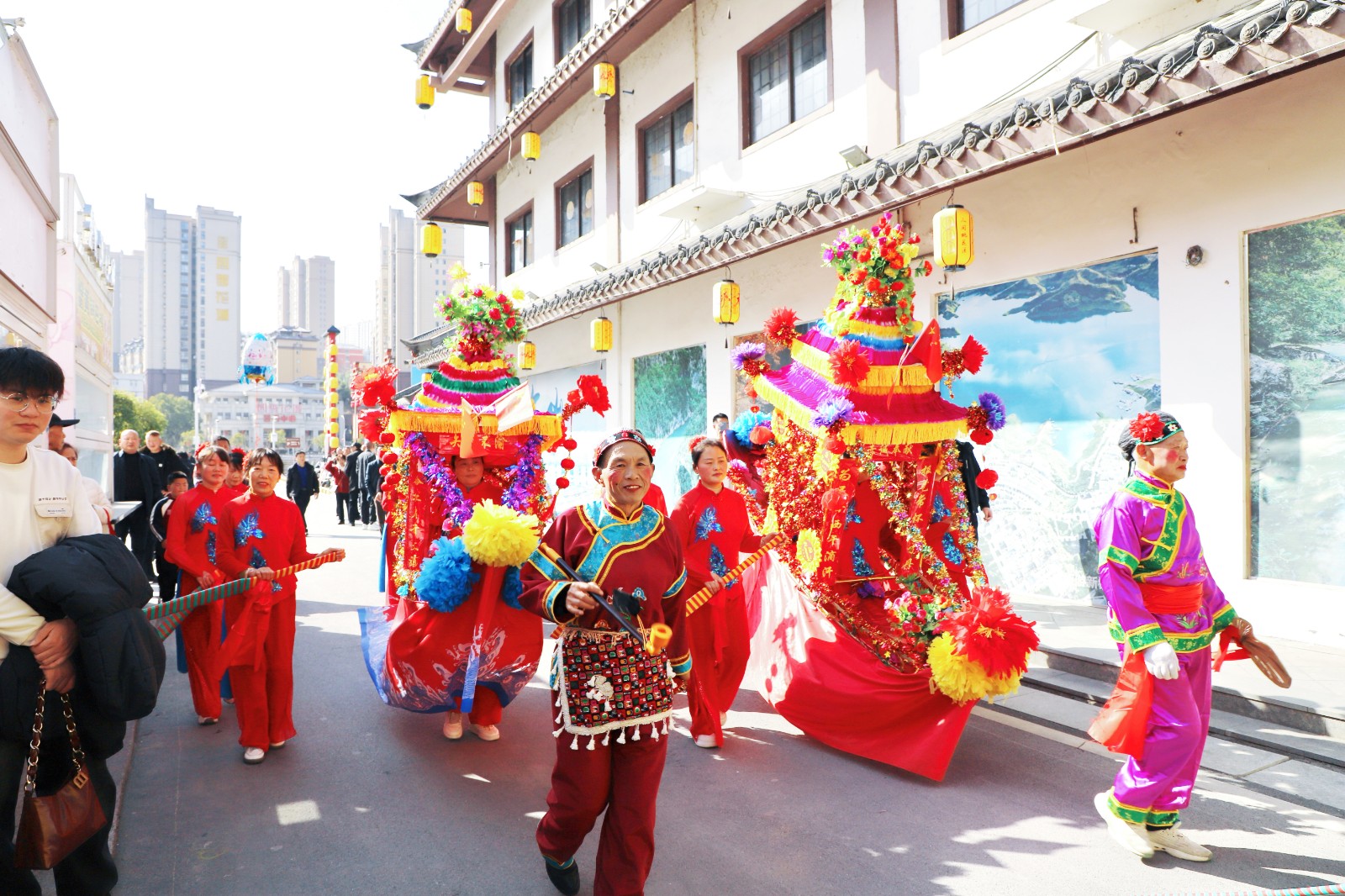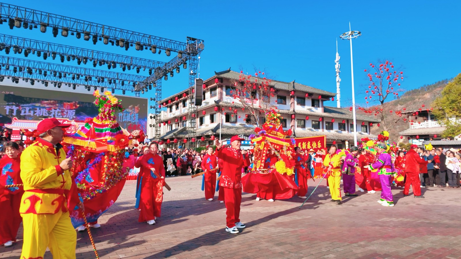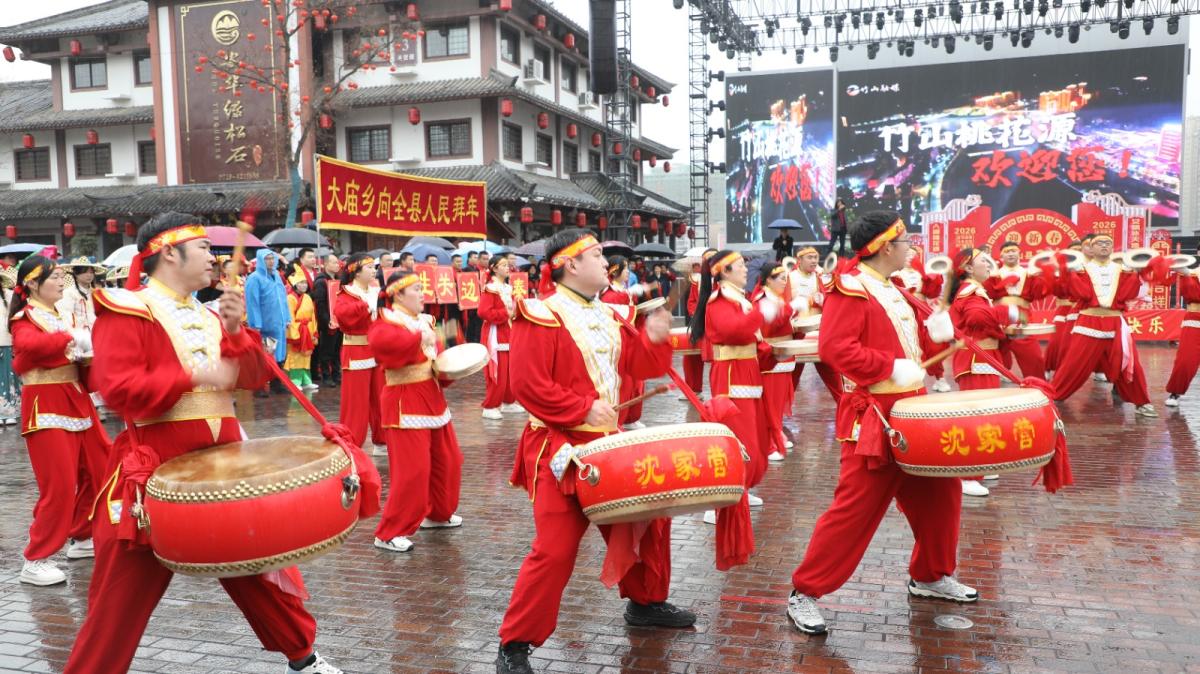 今日竹山网消息 新春佳节期间,宝丰镇组织参与春节民俗巡游活动,向全县人民致以新春问候。镇主要领导全程参与,与巡演队伍一同向沿途群众拜年。