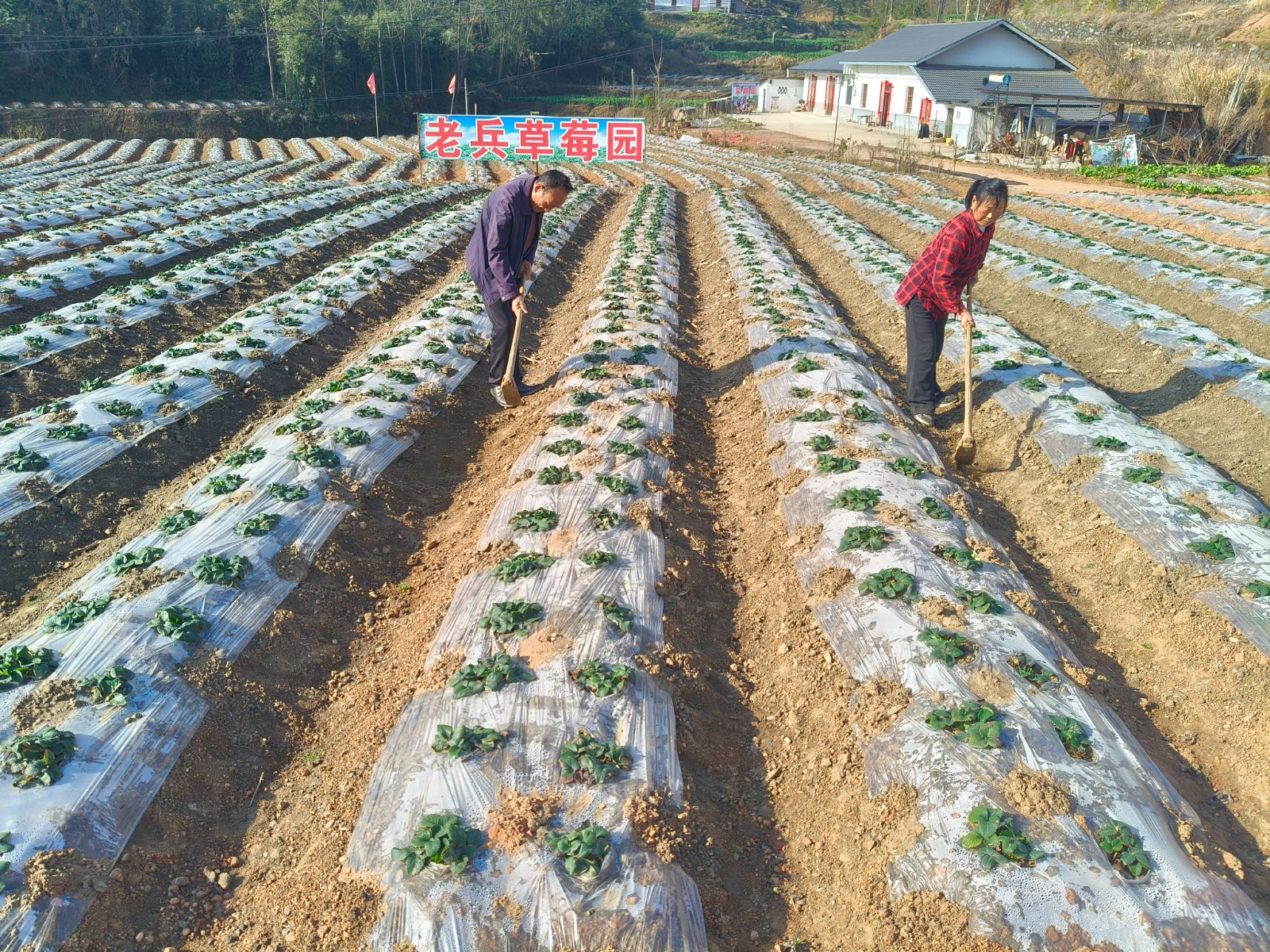 今日竹山网消息 2月22日,在竹山县溢水镇燕子山村,老兵草莓园里一派生机盎然的春管景象。整齐排列的草莓垄上覆膜保墒,翠绿的藤蔓长势喜人。退役老兵徐新运正与妻子穿梭其间,除草、梳理藤蔓,为丰收打下坚实基础。