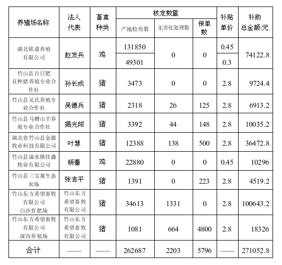 竹山县强制免疫疫苗“先打后补”养殖场自主采购疫苗补助经费公示表