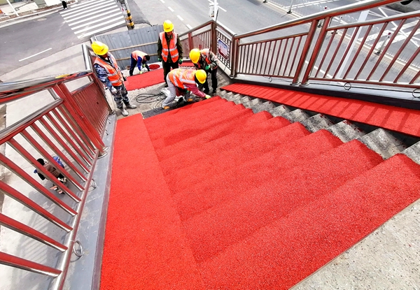 今日竹山网消息 3月3日,春日的暖阳洒在宝丰镇施洋小学门口的一级路旁,一座横跨道路的人行天桥上,工人们正忙碌地进行着桥面铺装作业。与往日桥体施工时的“钢铁碰撞”不同,当日的现场显得格外“柔和”——工人们手持刮板,细致地将一种色彩鲜艳、质地柔软的环保型EPDM合成橡胶材料均匀摊铺在桥面上,为这座即将服务数千名学生的“空中通道”穿上了一层“软铠甲”。