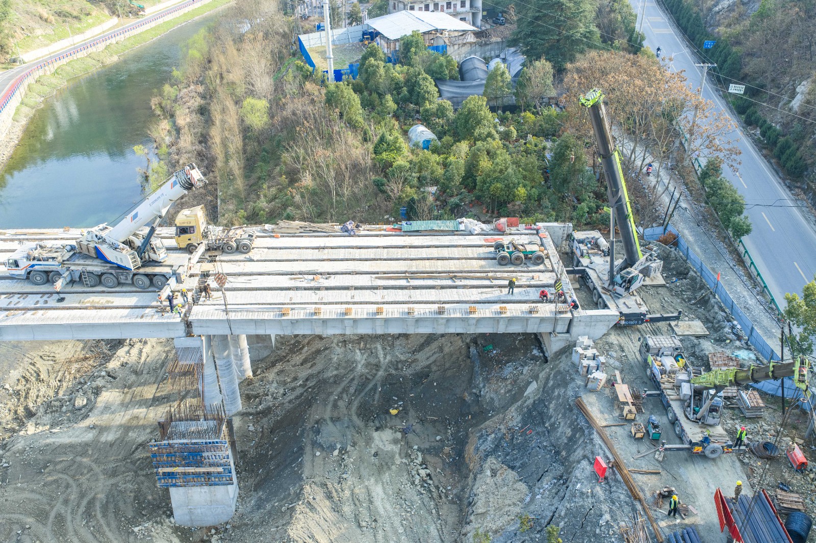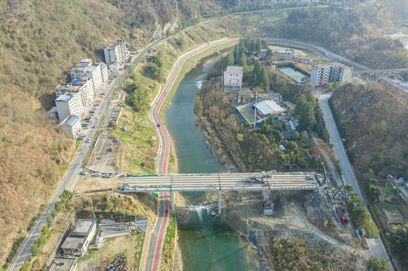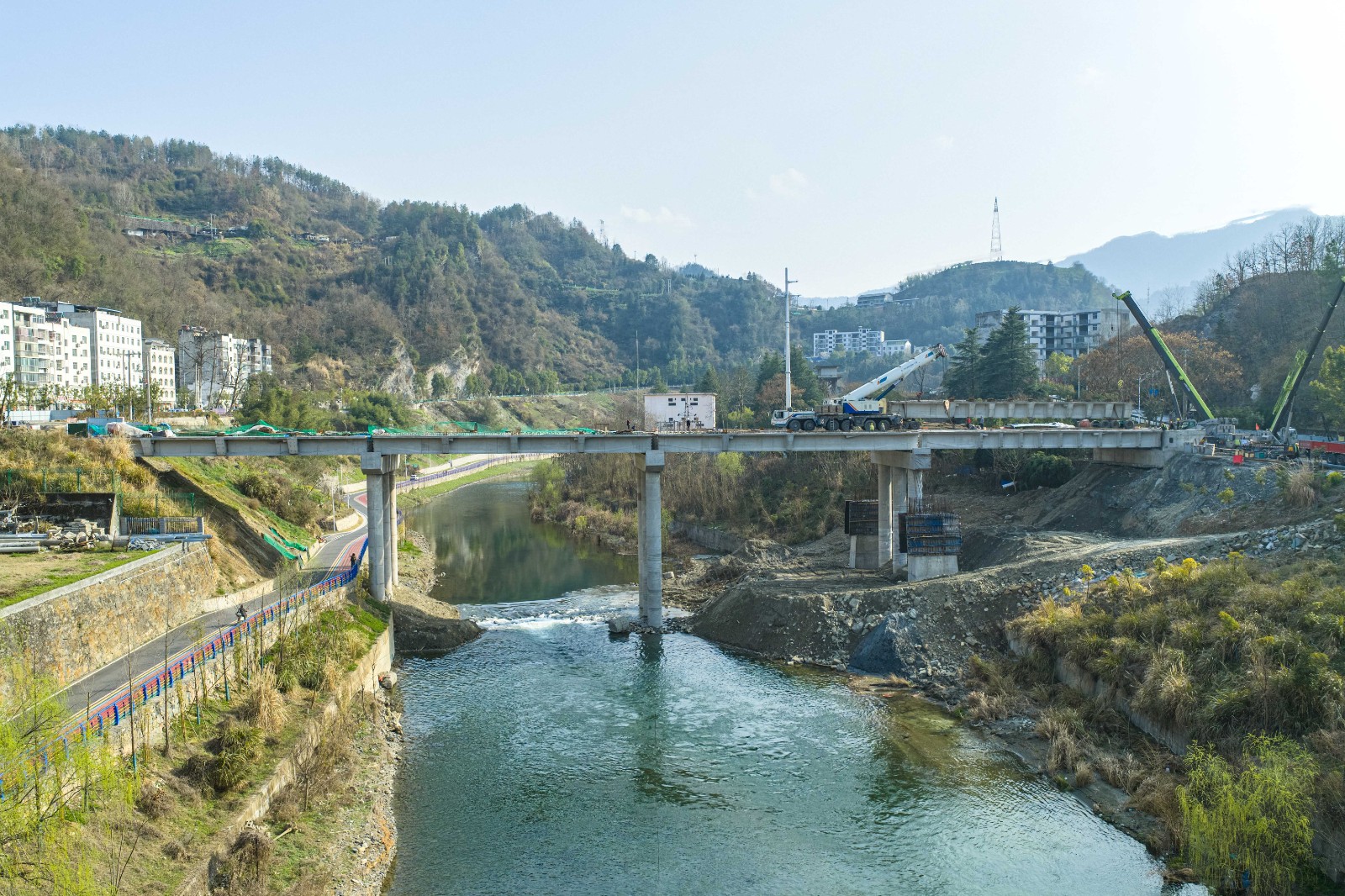 今日竹山网消息 3月5日,在竹山县346国道新建霍河大桥施工现场,随着最后一片预制T梁缓缓落在桥墩上,标志着该大桥的主体工程基本竣工,整个工程正式转入桥面施工阶段,预计6月30日前具备通车条件。