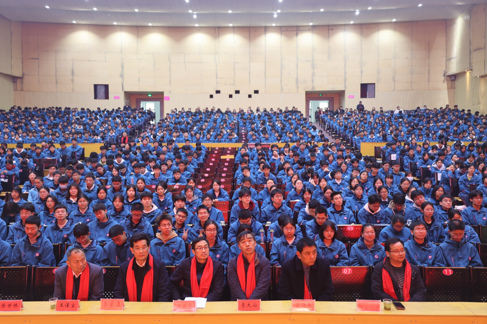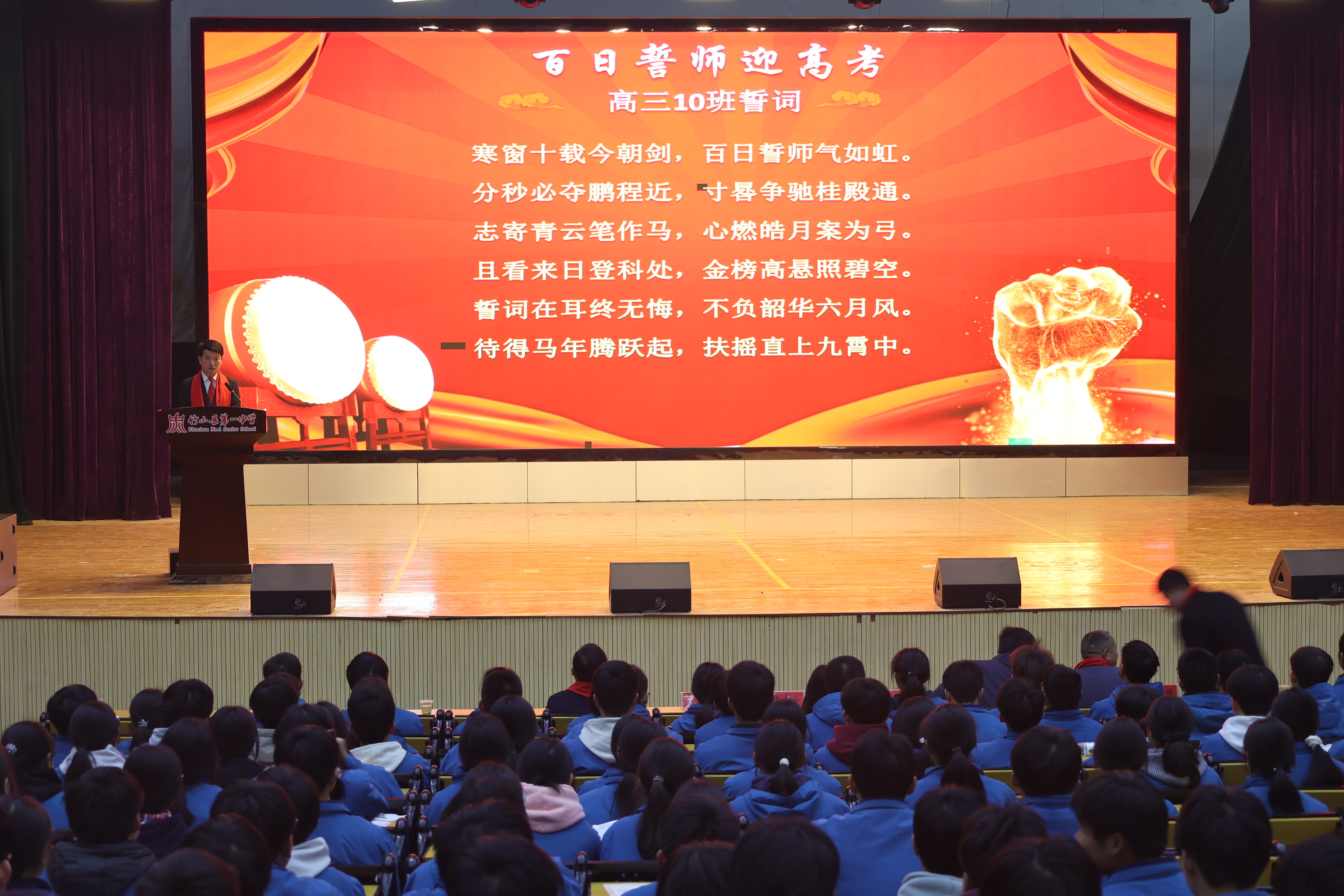 宣誓环节,全体教师庄严宣誓,承诺恪尽职守、科学备考;全体学生高举右拳,誓言铿锵有力。21个班级依次喊出斗志昂扬的口号,现场气势如虹,尽显青春斗志。