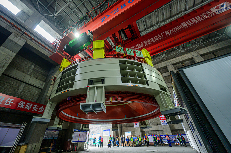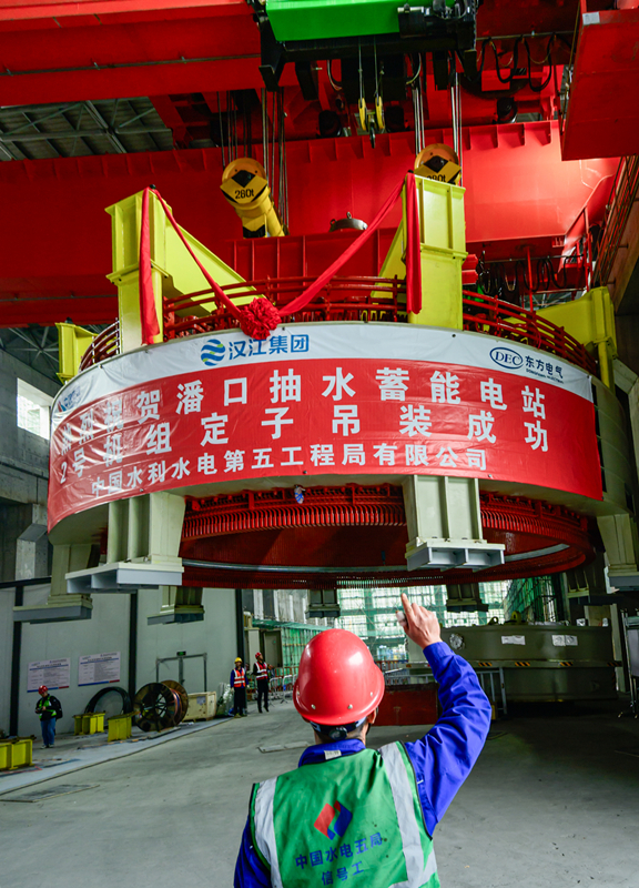 今日竹山网消息 3月12日,在潘口抽水蓄能电站水电机房内,中国水电五局工作人员将一个205吨的定子精准吊装到2号机组机坑。至此,电站内两台机组定子全部吊装完成,标志着电站机电设备安装取得重大阶段性成果,为后续机组总装、调试及按期投产奠定坚实基础。