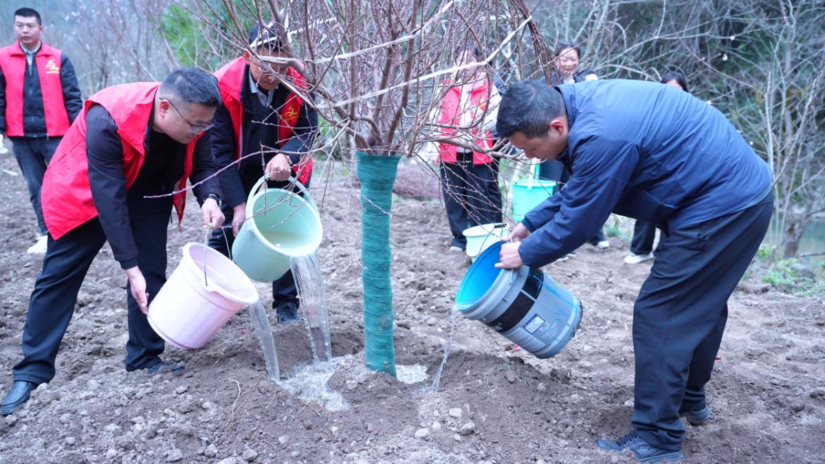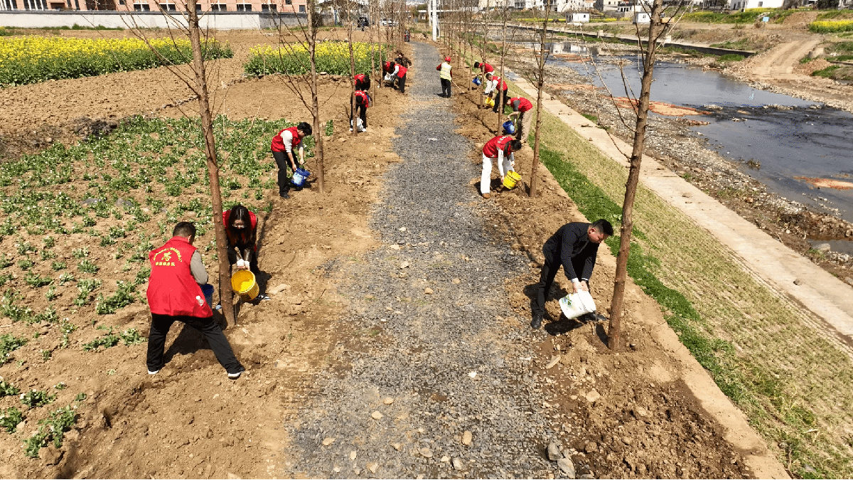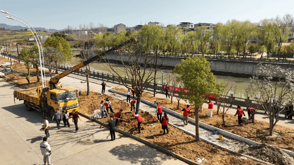 今日竹山网消息 宝丰镇组织干部群众及志愿者在白鹭河及集镇河道沿岸开展义务植树活动。