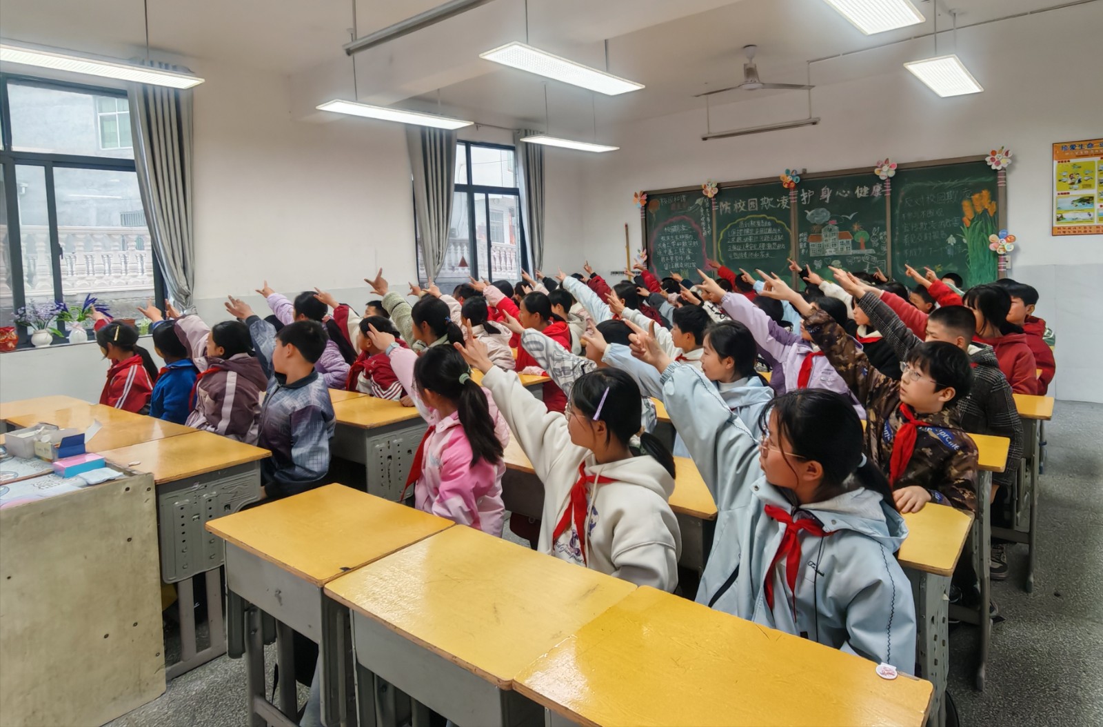 一直以来,学校始终把学生身心健康放在首位,聚力打造活力阳光校园。面对降雨天气无法开展室外体育活动的情况,学校及时启动室内运动预案,以桌操为载体,让孩子们在教室舒展筋骨、释放活力。伴随着轻快节奏,同学们认真完成抬手、转体、伸展等动作,规范有力。小小课桌间,虽无宽阔操场,却尽显专注与整齐;淅沥雨声里,虽无奔跑身影,却洋溢蓬勃朝气与向上力量。