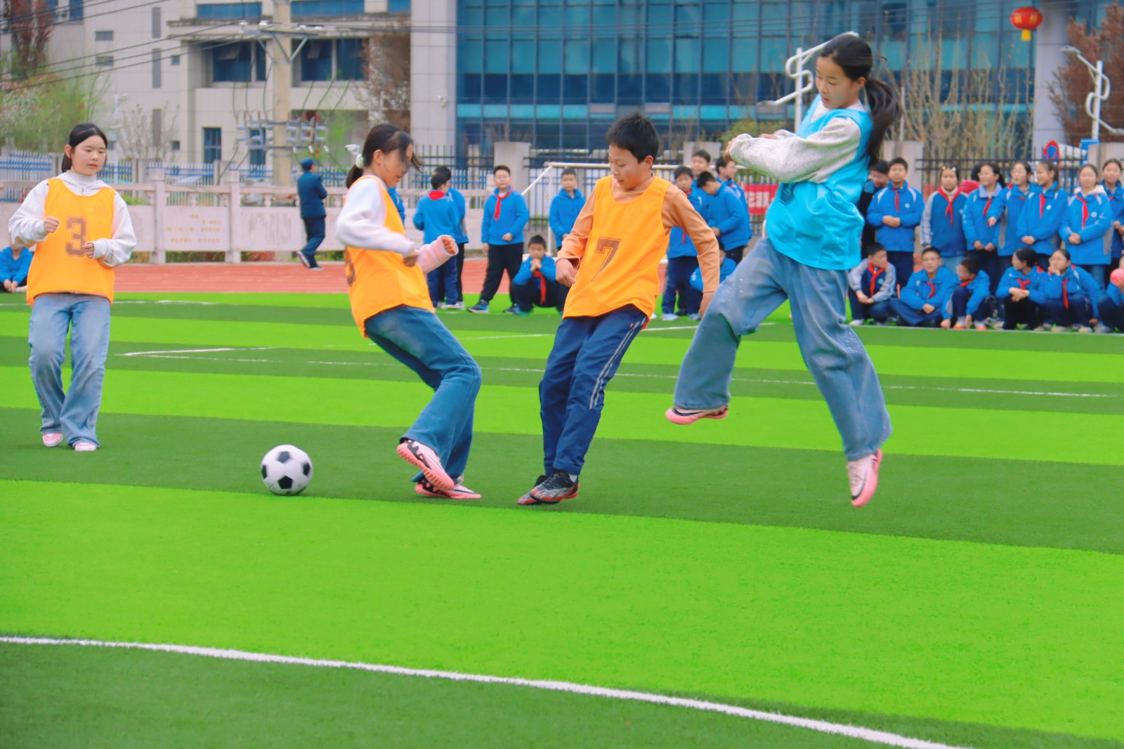 联赛分班级联赛(班超)与校园联赛(校超),赛程贯穿春季学期,覆盖一至六年级。赛事依学生身心发展规律规划赛制:三至六年级采用5人制混合赛制;一、二年级以趣味点球大战开展。比赛利用下午大课间分年级有序进行,赛后将为冠军球队、前三名球员颁奖。绿茵场上,小球员奔跑、传球、抢断、射门,配合默契、奋力拼搏;场边师生欢呼助威声不断。