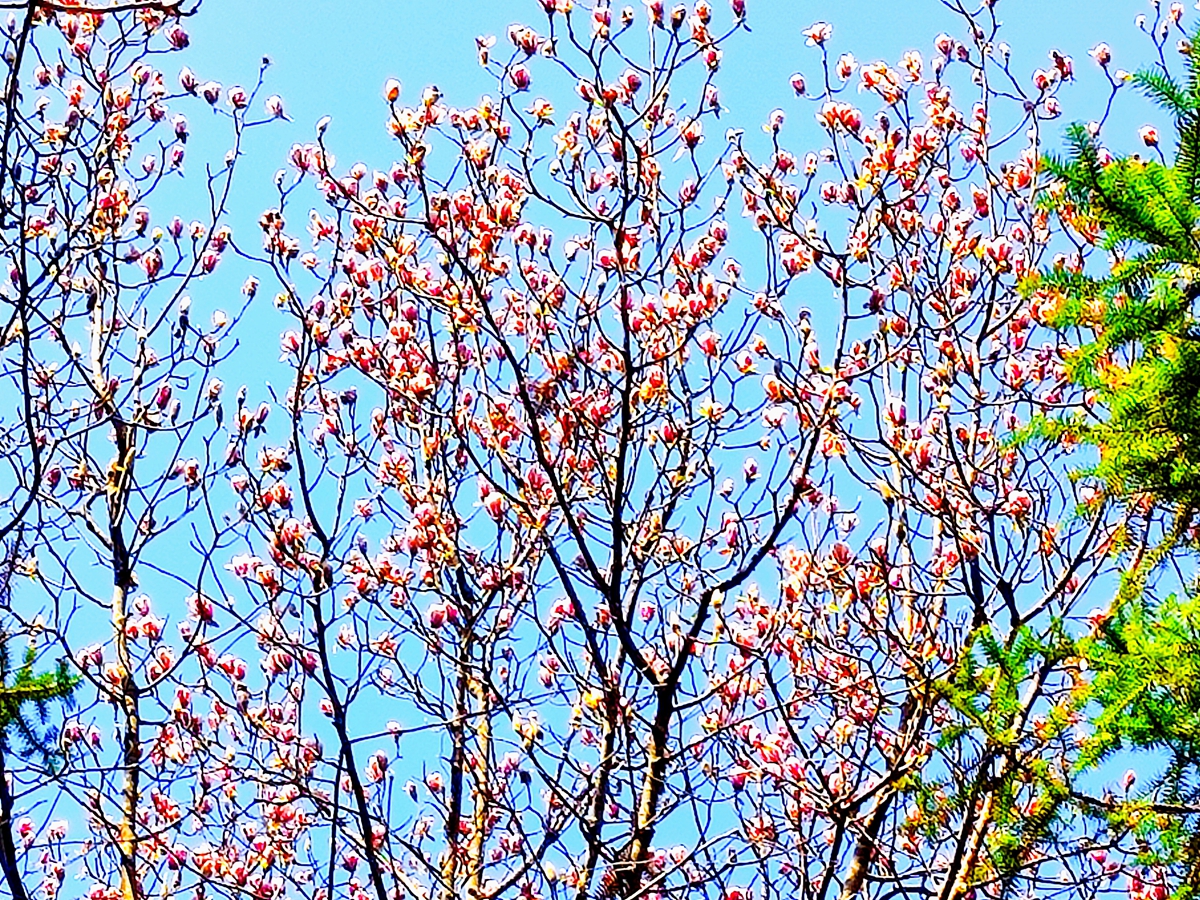 辛夷花,又名望春,玉兰属木兰科,落叶乔木,高数丈,木有香气。花初出枝头,苞长半寸,而尖锐俨如笔头因而俗称木笔。及开则似莲花而小如盏,紫苞红焰,作莲及兰花香,亦有白色者,人又呼为玉兰。它不似樱花那般娇柔,也不似牡丹那般雍容,枝干苍劲挺拔,向着蓝天肆意伸展,花朵便开在这苍劲的枝头,显得格外端庄大气。初开时,花瓣裹着淡淡的紫晕,如少女含羞的脸颊,渐渐舒展后,粉白、淡紫、玫红的花瓣层层叠叠,温润如玉,轻盈似蝶。有的含苞待放,尖俏的花苞宛若毛笔头,蘸着春光,欲写尽山间春色;有的半开半合,藏着几分娇羞;有的全然绽放,迎着风,向着光,落落大方,将整座山都装点得温柔又烂漫。