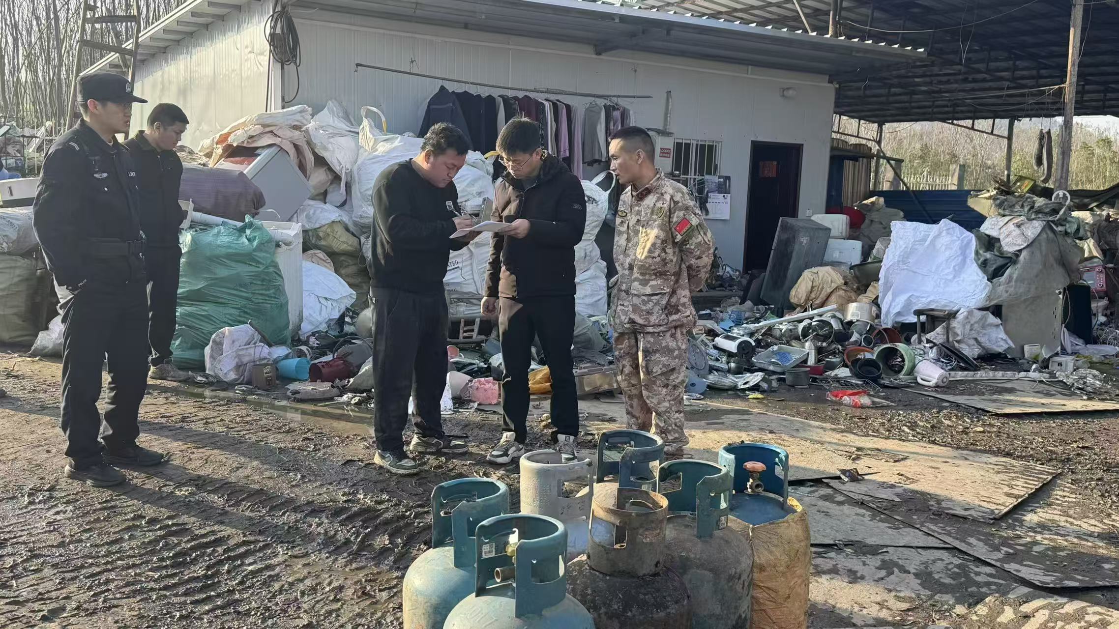 行动由镇应急办牵头带队,执法人员深入各废品收购站点,逐一检查消防安全、用电用气、物品存放等情况,做到不留死角、不漏隐患。经现场排查,发现一家收购站违规存放废旧液化气钢瓶,存在极大安全风险,执法人员立即依法处置,暂扣危险物品,并启动立案调查程序。