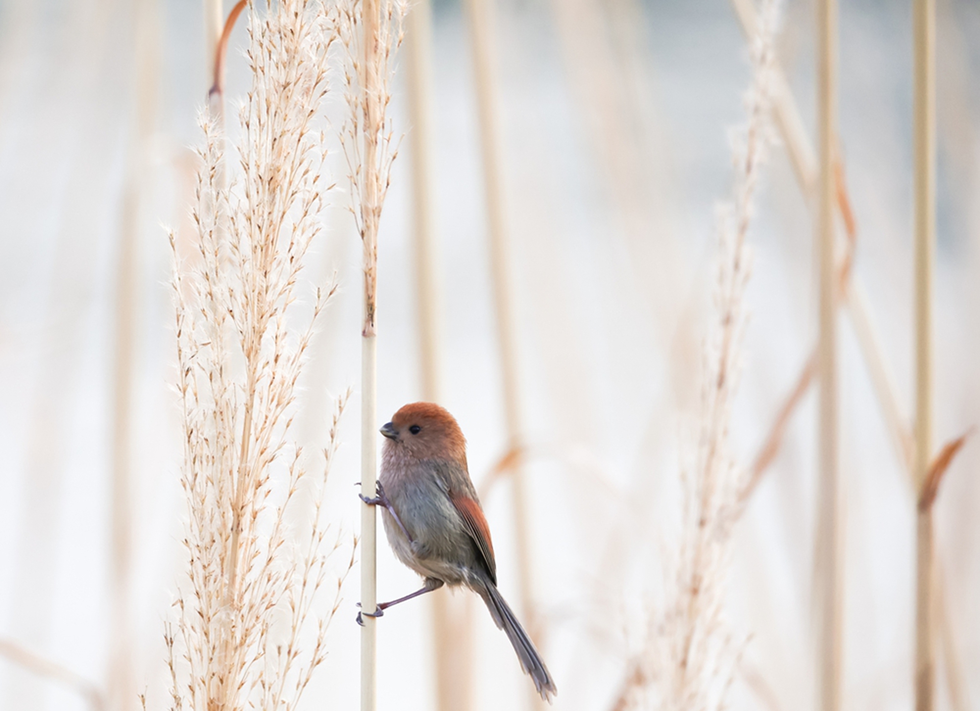 作为典型的林缘灌丛栖息鸟类,棕头鸦雀主要生活在中低山阔叶林、混交林林缘灌丛及芦苇沼泽中,如今在公园、苗圃和城市绿地也能偶尔见到它们的身影。它们生性活泼,常以成对或小群体形式活动,食谱以昆虫为主,同时也会食用植物果实和种子,在控制害虫数量、维护生态平衡中发挥着重要作用。(程平)