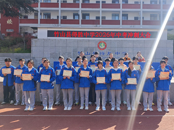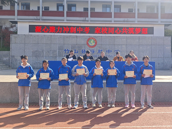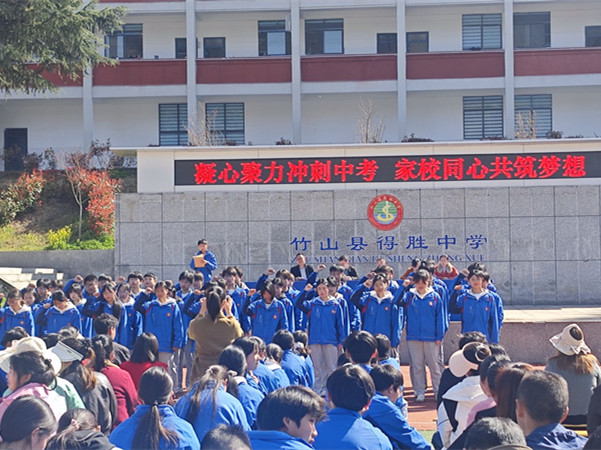今日竹山网消息 4月1日上午,得胜中学在操场上隆重举行了九年级中考表彰和誓师冲刺大会。学校领导、九年级全体师生及大部分学生家长共同参加了此次盛会。