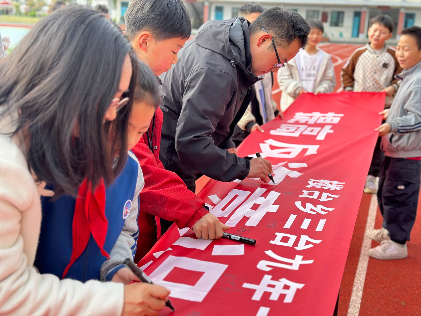 宣讲结束后,学校组织反诈集中签名活动,师生在宣传横幅上签名作出承诺。同时向全体学生发放反诈承诺书,由学生阅读并签字,强化反诈意识,推动反诈知识入脑入心,实现“教育一名学生、带动一个家庭”的宣传效果。