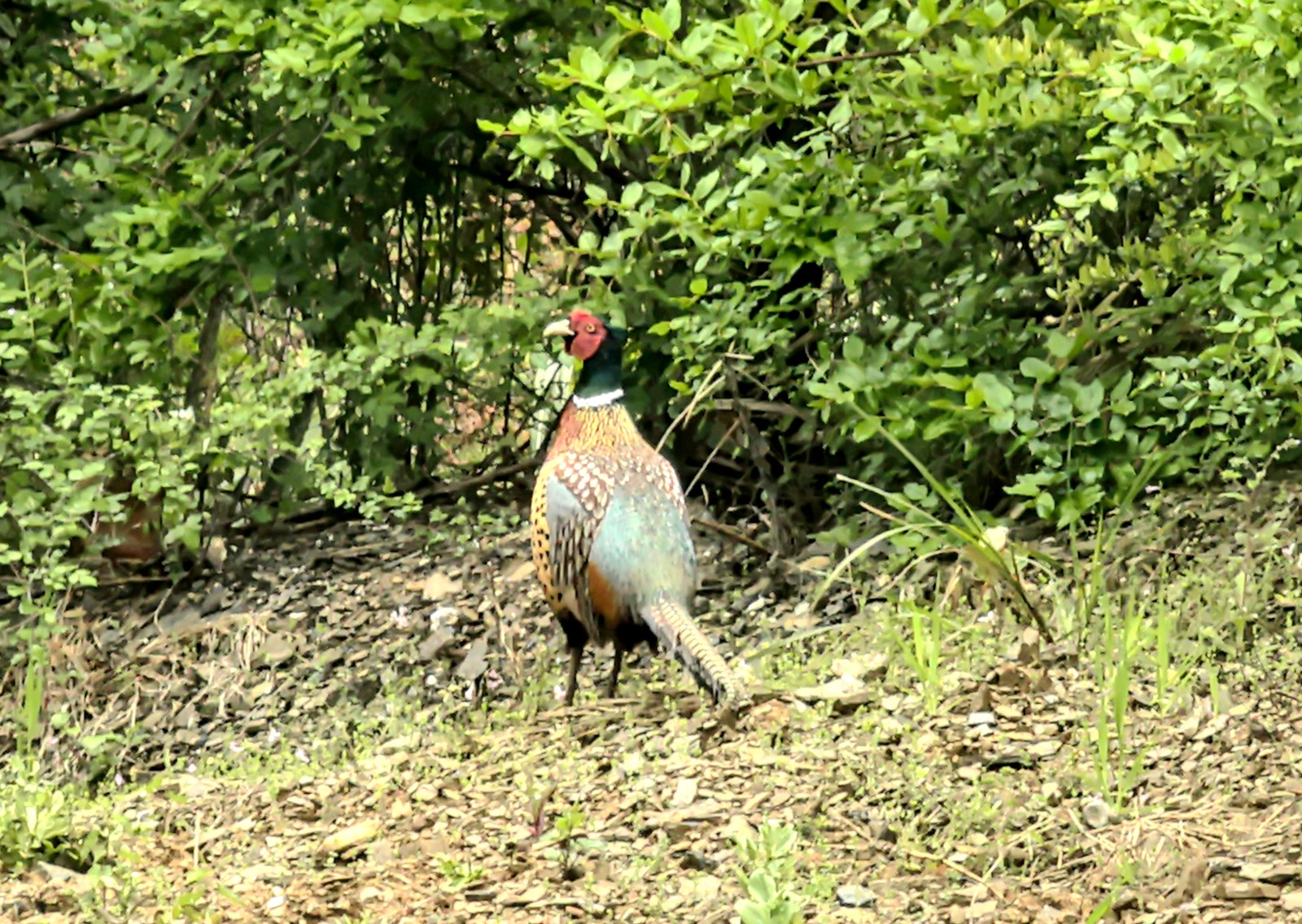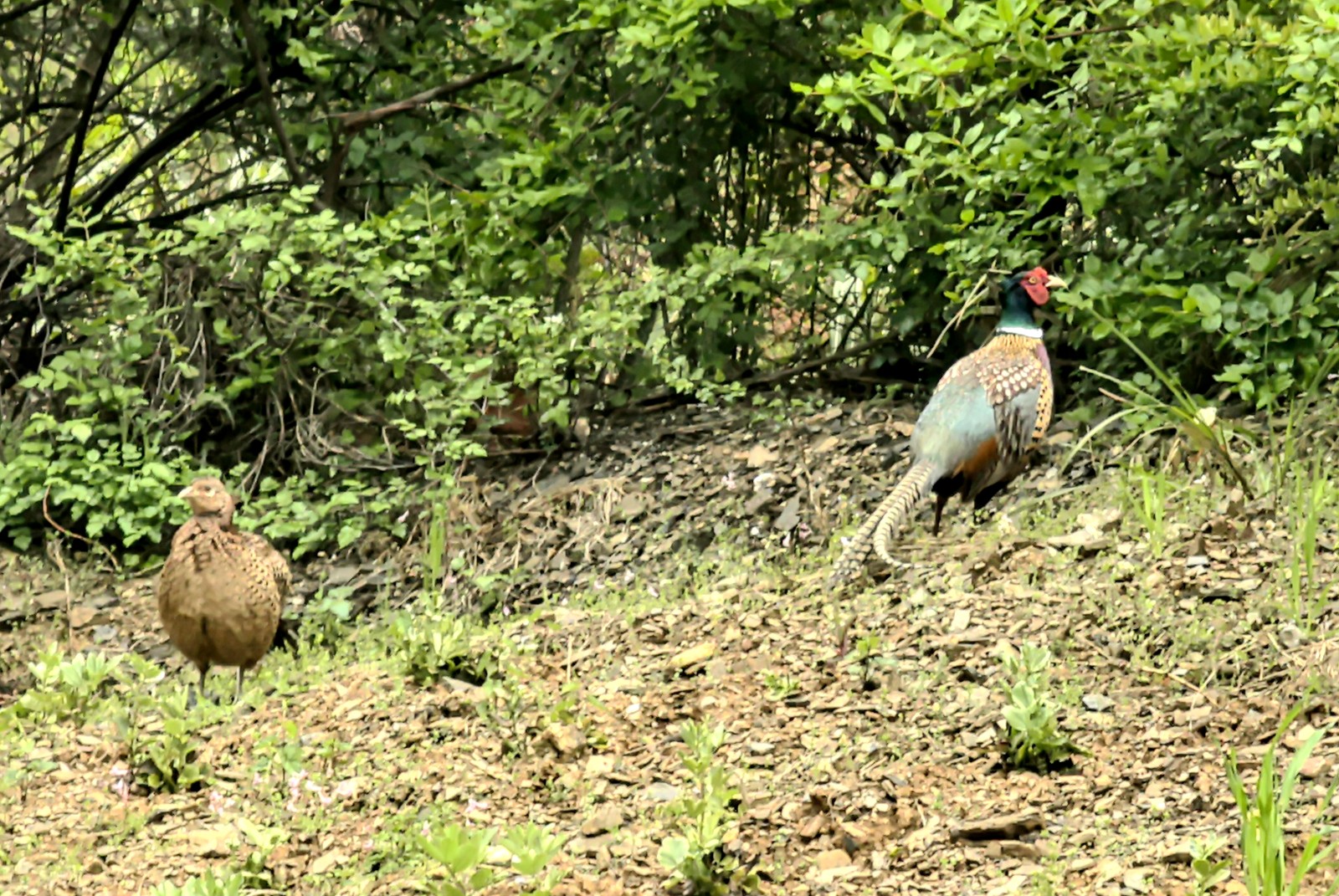 两只环颈雉时而并排、时而一前一后,在灌木丛边缘啄食嫩芽、昆虫和草籽。雄性不时抬头张望,似在“警戒”,雌性则专注觅食,偶尔雄鸟发出清脆叫声,雌鸟轻声回应,画面温馨。约三四分钟后,它们才不紧不慢地消失在密林深处。