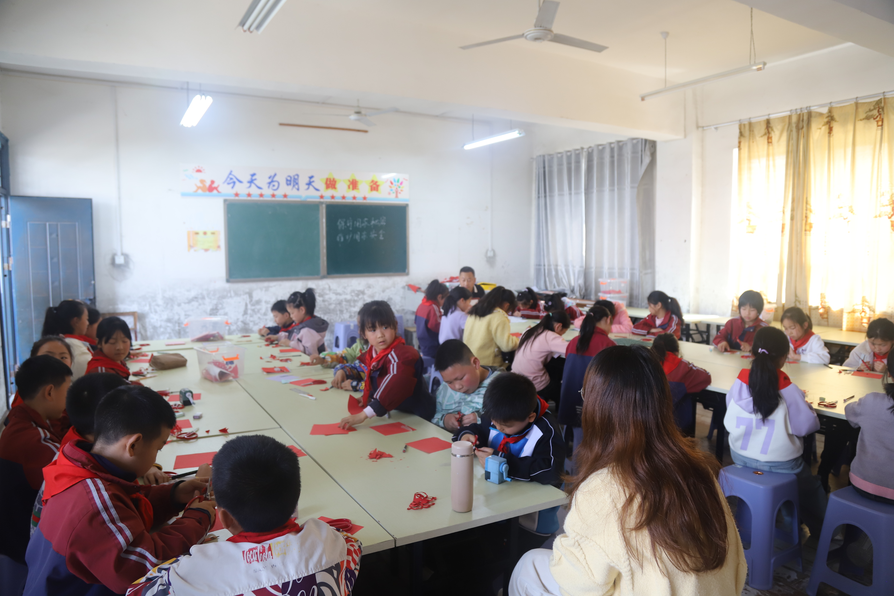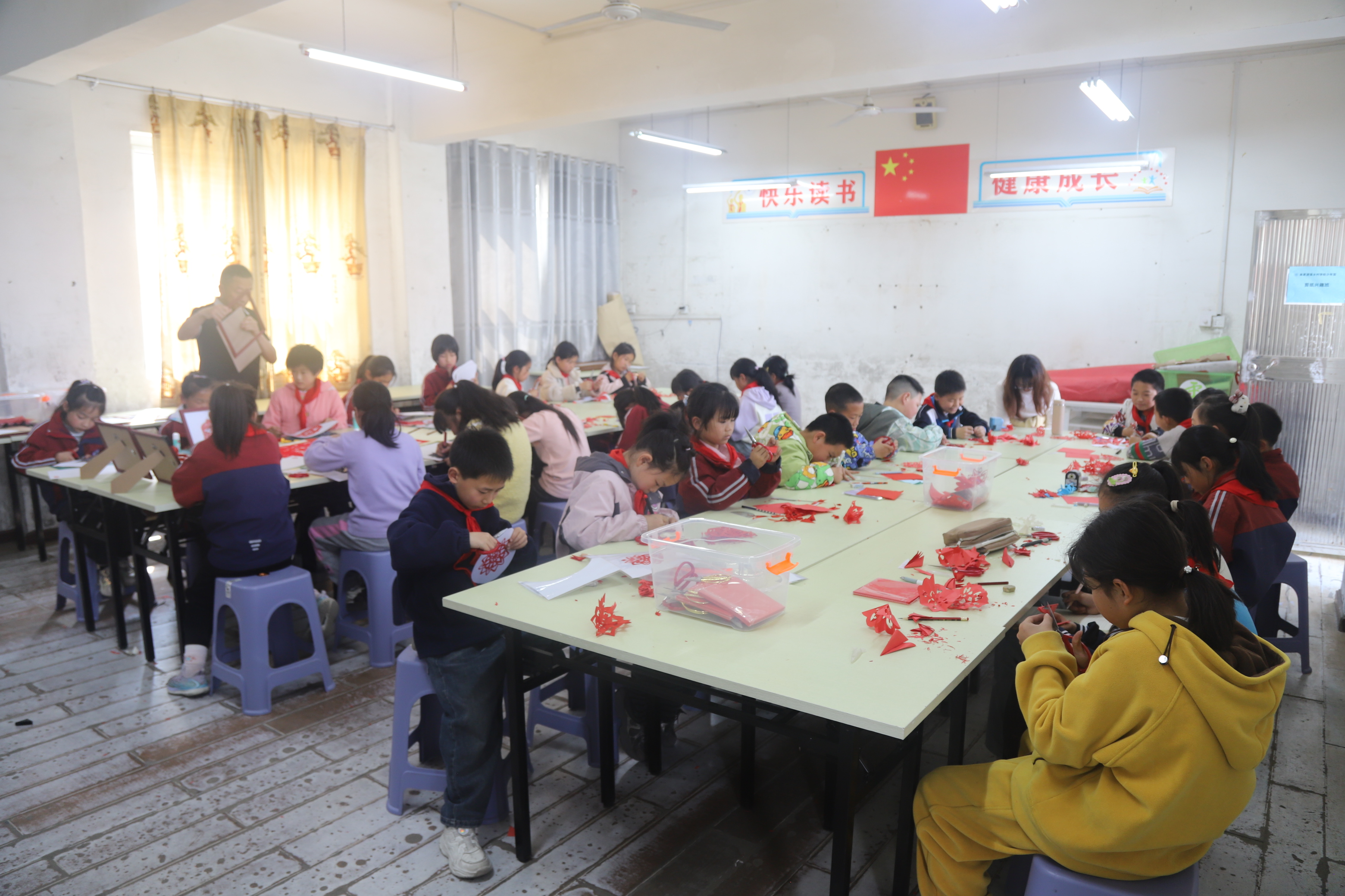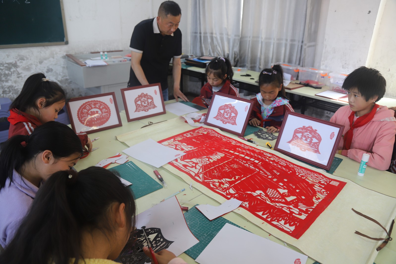 剪纸创作环节暖意融融,老师耐心细致地指导同学们折纸、画稿、裁剪,手把手传授剪纸技巧。同学们手持剪刀,神情专注,将警钟、五角星、太阳、和平鸽等象征安全与和平的元素,与“总体国家安全”字样巧妙融入红纸之中。剪刀起落间,一幅幅精巧别致、主题鲜明的剪纸作品相继成型,既展现了竹山非遗剪纸的独特魅力,也寄托着青少年对国家安全的理解与守护之心。