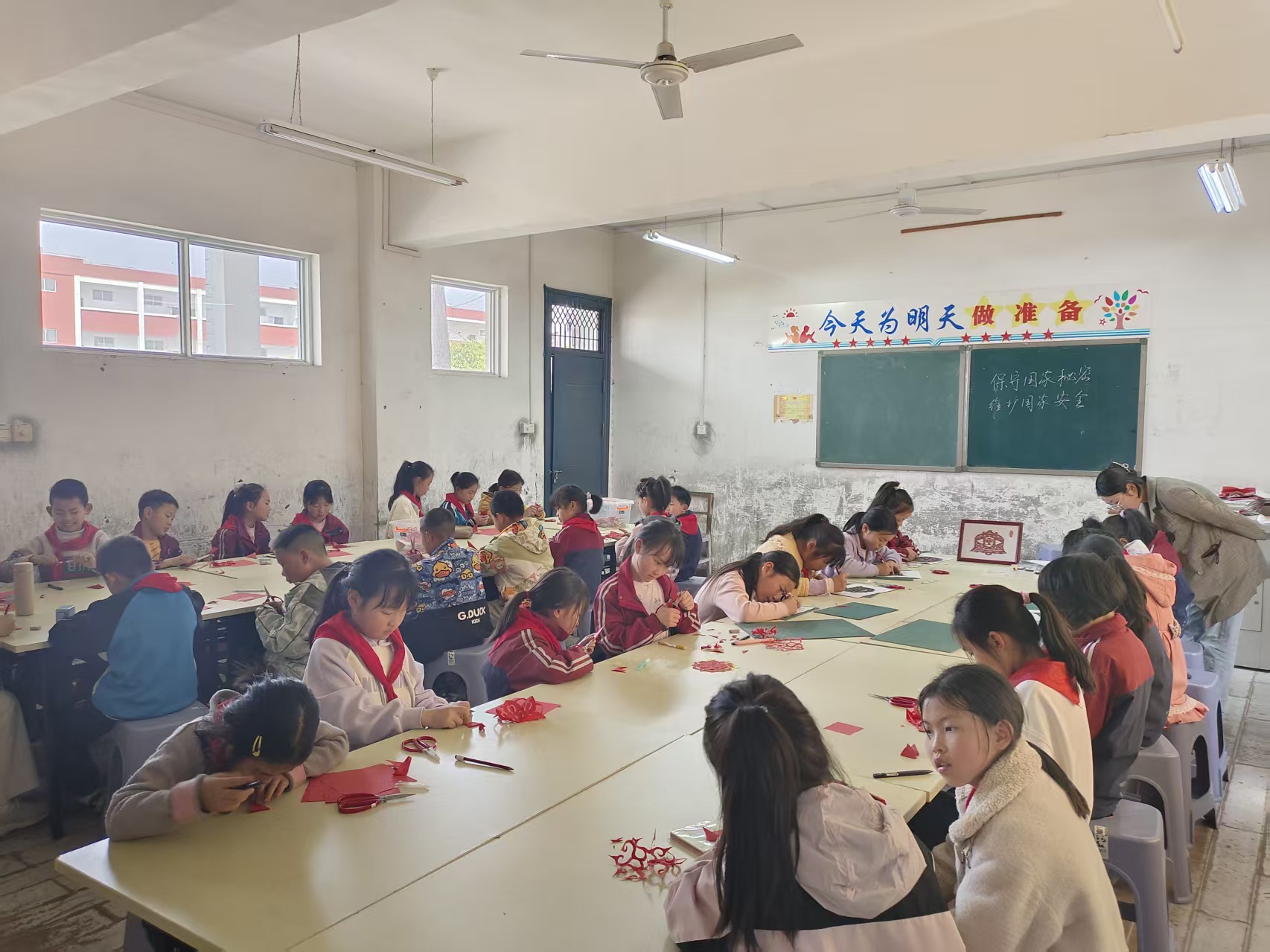 活动现场,授课老师以通俗易懂、生动鲜活的语言,讲解网络安全、校园安全、国防安全、公共卫生安全等与青少年学习生活息息相关的国家安全知识,清晰阐释“国家安全无小事,人人都是守护者”的理念。在非遗剪纸实践环节,老师手把手教授折纸、画稿、裁剪等剪纸技巧,耐心指导同学们进行创作。同学们满怀热情、专注投入,将警钟、五角星、和平鸽、太阳等象征国家安全、和平美好的元素,与“总体国家安全观”主题文字有机融合,在一刀一剪、一纸一墨间,完成了一幅幅主题鲜明、寓意深刻的剪纸作品。此次活动既传承弘扬了竹山非遗剪纸文化,又让青少年在动手实践中学习国安知识、强化安全意识,实现了传统文化浸润与安全教育的双向赋能。