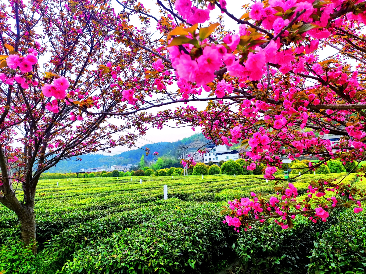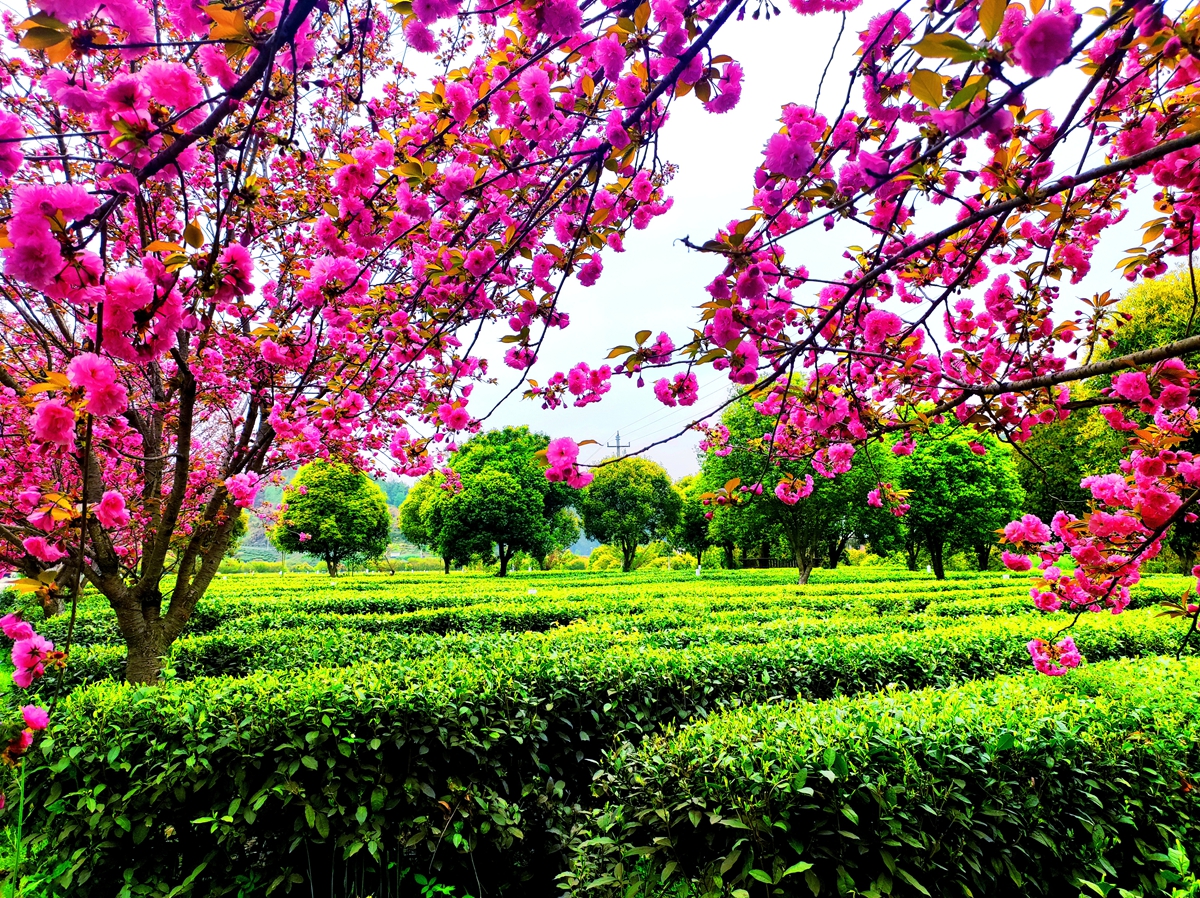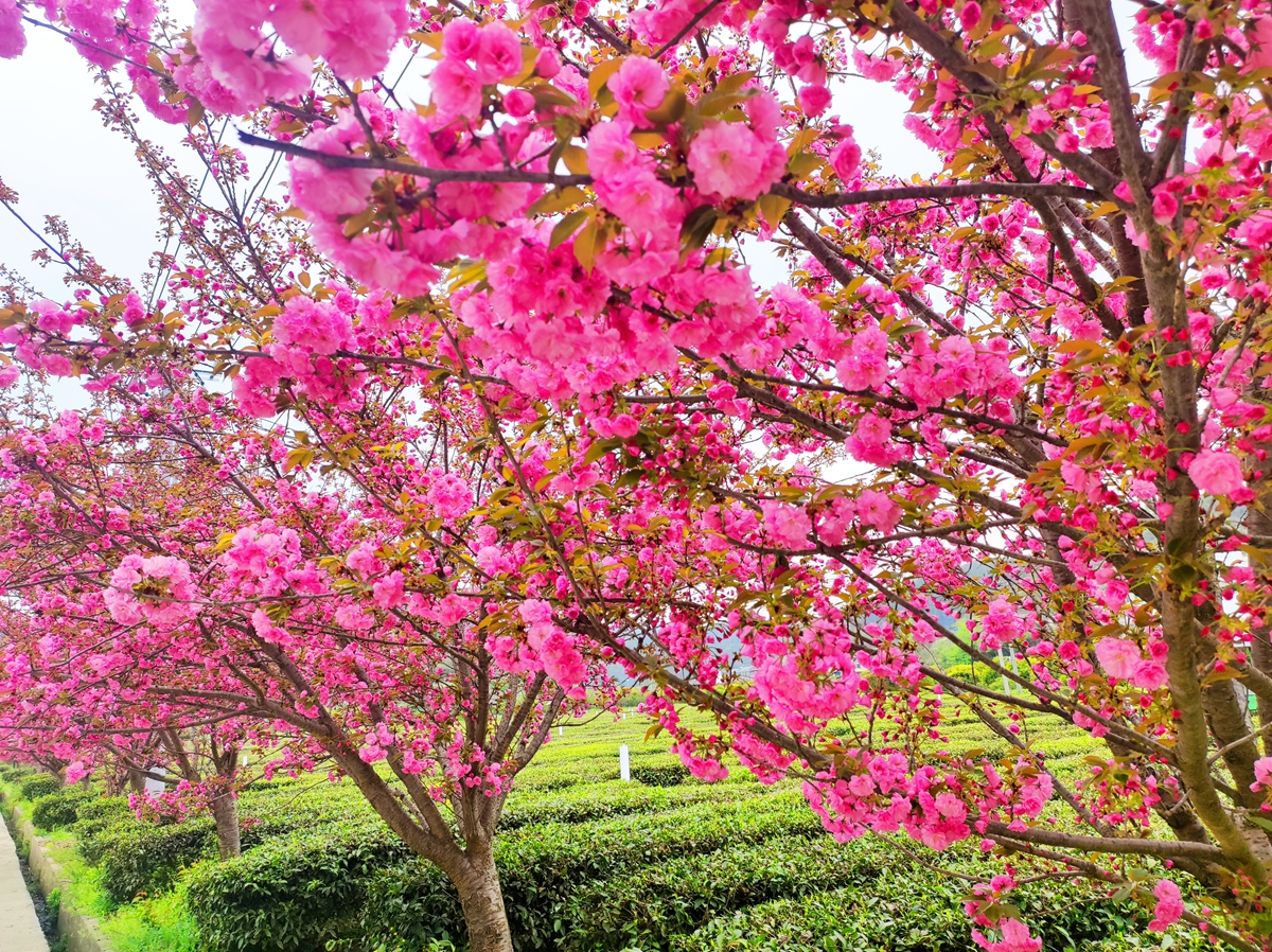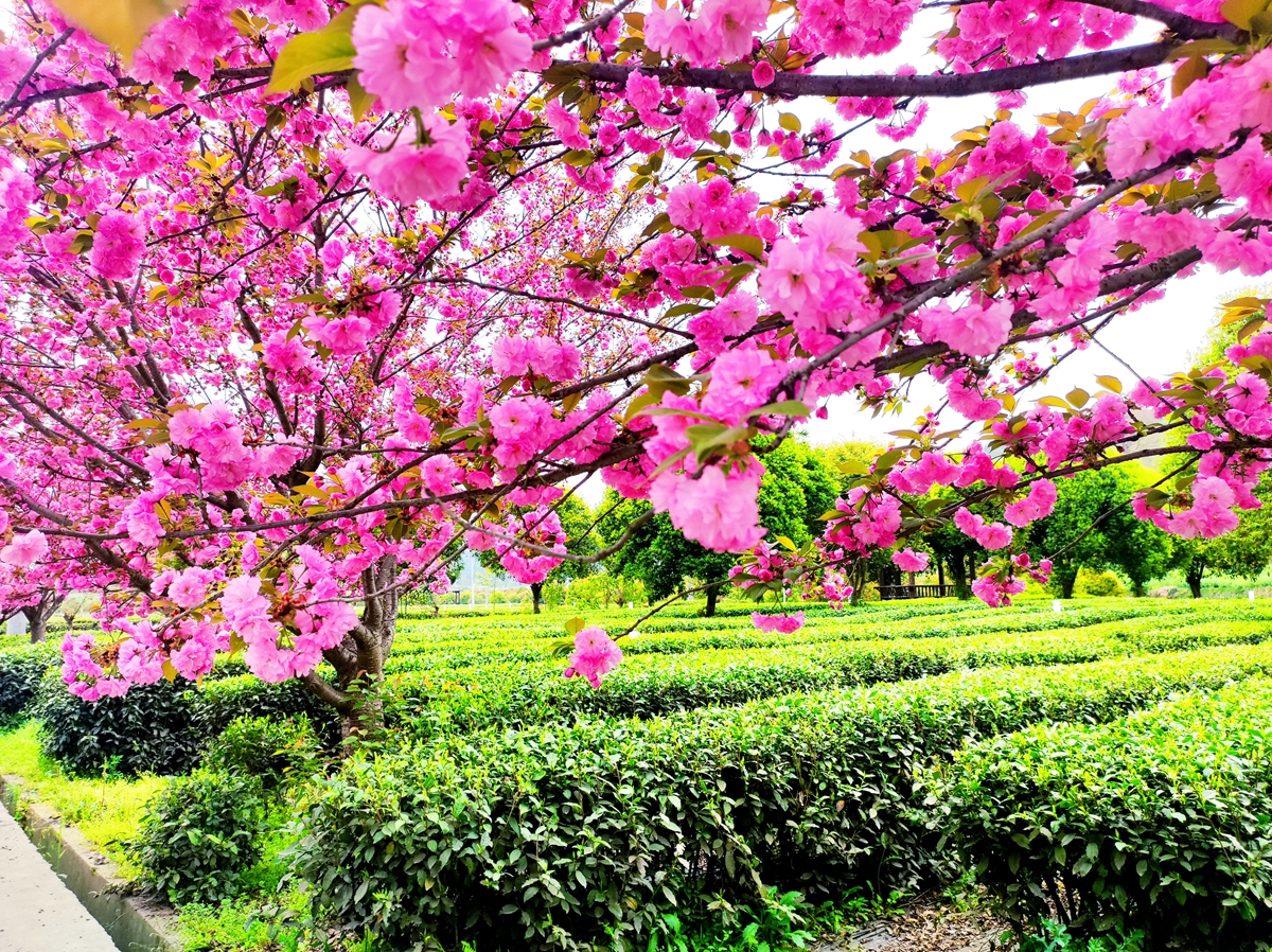漫步茶园,粉白樱花缀满枝头,如云似雪、随风摇曳,细碎花瓣飘落成唯美花雨,淡淡花香与清新茶香交织,美不胜收。层层叠叠的茶垄绵延起伏,花景与茶园勾勒出醉人的田园画卷,成为春日踏青的绝佳去处。