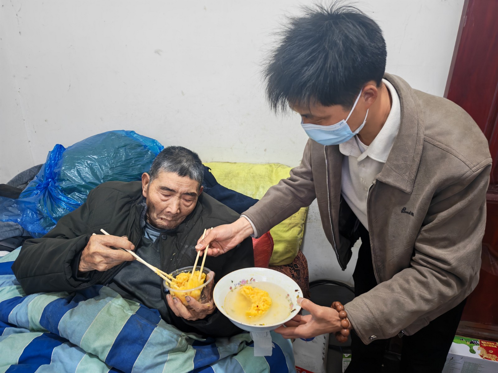 得知村内五保户病危、生活无法自理的情况后,天桥村“两委”干部与驻村工作队第一时间响应,连夜赶往老人家中。大家分工协作、细致照料,为老人送上热乎饭菜与干净饮用水,耐心打扫屋内卫生、整理生活用品,让老人在病痛中感受到干净整洁与温暖安心。村“两委”干部俯身查看老人身体状况,轻声安抚情绪,详细询问饮食与就医需求,叮嘱老人安心休养。