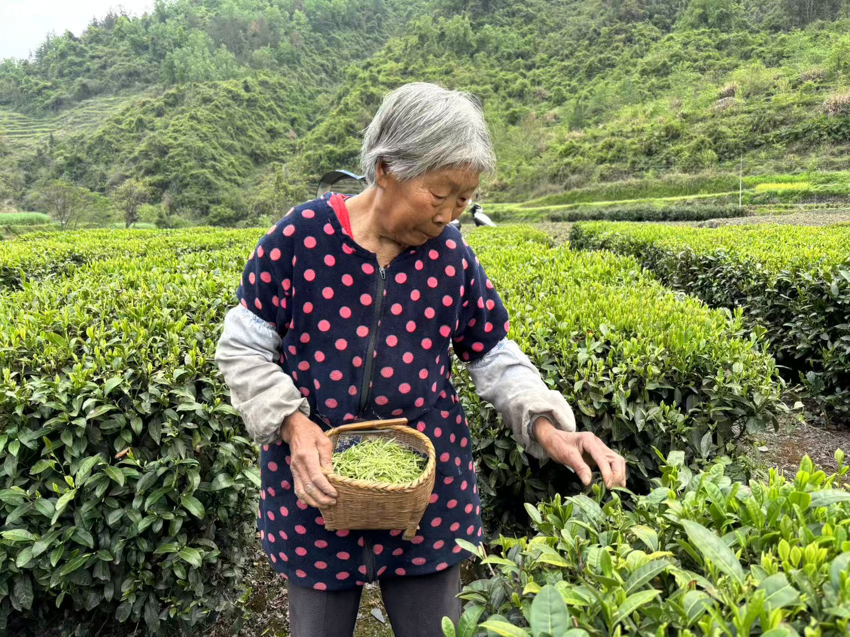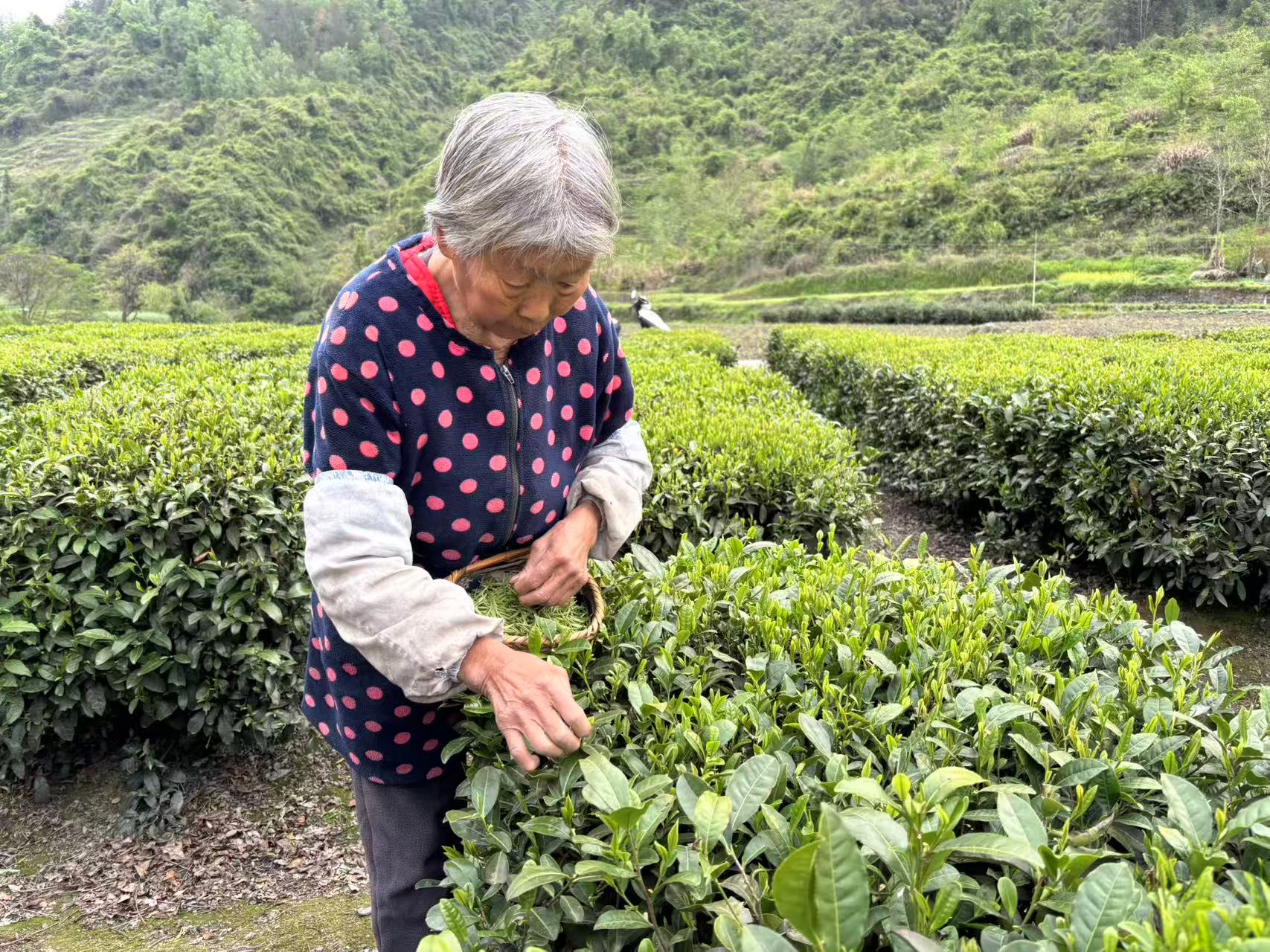 老人的动作因年纪大了稍显迟缓,却依旧精准娴熟,采摘间隙还不忘细心剥去散叶的外壳,只为保证每一片鲜叶的品质。她和老伴相互照应,一天能采一斤多鲜叶,春茶开园不到一月,老两口已经赚了两千多元。“我们身子骨还硬朗,能自己挣点钱就不给儿女添负担,现在采茶叶收入稳当,日子过得踏实。”谌奶奶的话质朴却有力量,这是老一辈刻在骨子里的坚韧,也是茶产业给村民托底的稳稳幸福感。