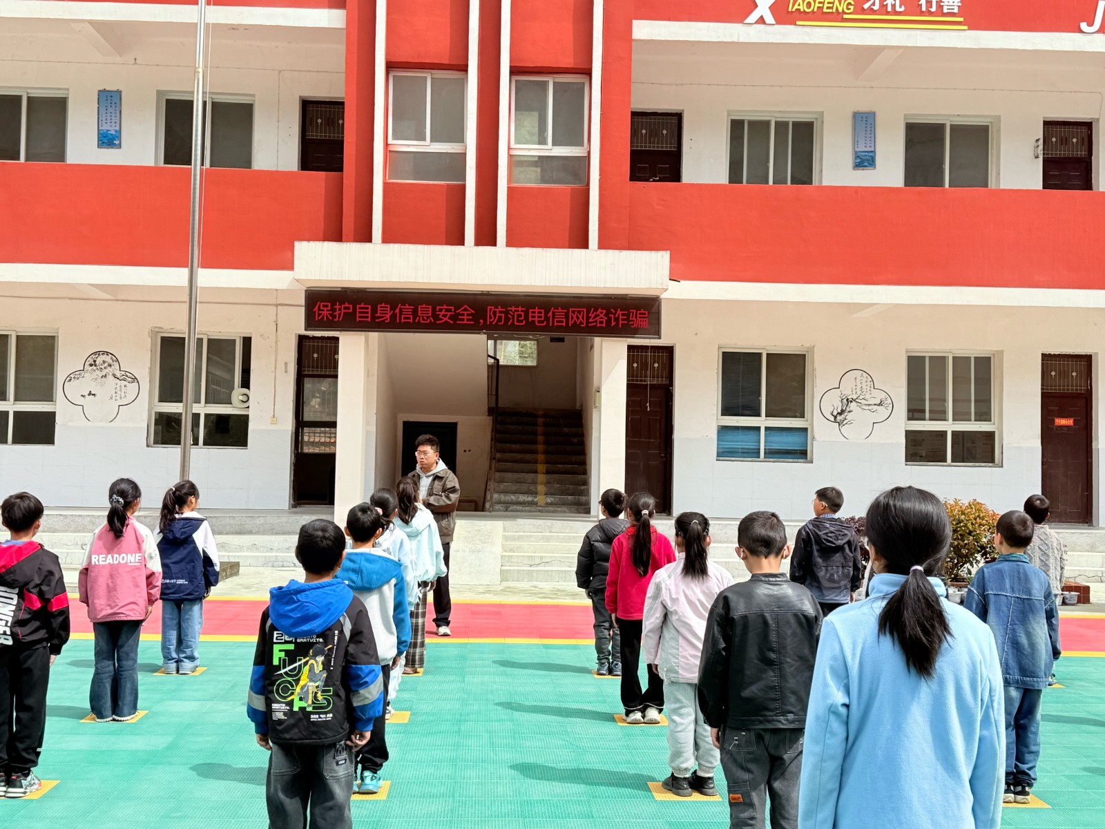 活动现场,学生们整齐列队,认真聆听。学校操场的红色教学楼前,国旗飘扬,电子屏滚动播放防诈标语,营造出浓厚的安全教育氛围。通过“案例+讲解+互动”的形式,学校将反诈知识生动传递,让安全意识扎根学生心中。