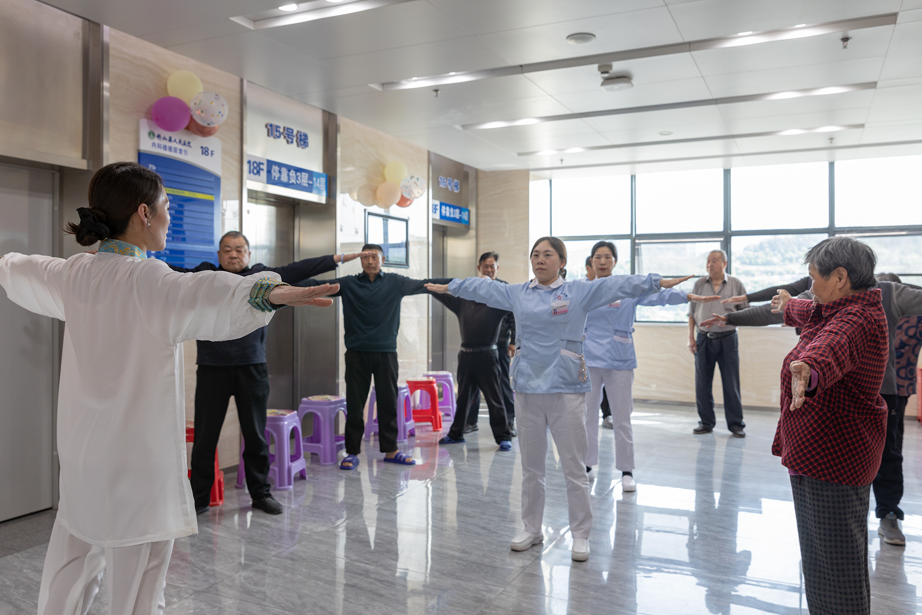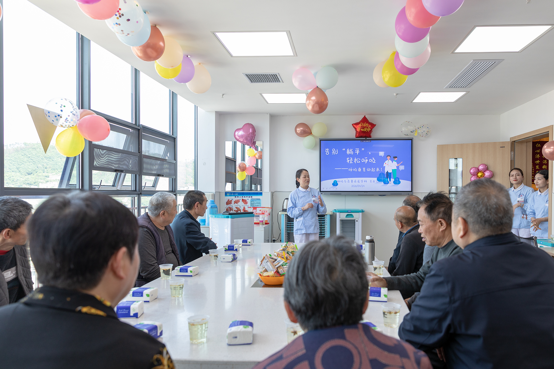 护士吴亚兰以“长期卧床会导致肌肉萎缩、骨质疏松、血栓”等危害开场,瞬间吸引患者及家属注意。她围绕《告别“躺平”,轻松呼吸》主题,用PPT讲解“动起来”的益处,纠正“生病就该躺着”的误区,强调呼吸康复的重要性。有奖问答环节气氛热烈,大家积极抢答,健康知识深入人心。随后,医护人员发放满意度问卷,收集患者意见建议。活动最后,医护人员带领大家一同练习呼吸操和八段锦,逐节示范讲解,抬手、扩胸、弯腰,每个动作舒展柔和。大家跟着口令缓缓抬手、慢慢呼气,逐步舒展身体。不少患者表示,练完后胸口不憋闷了,整个人都轻松了。