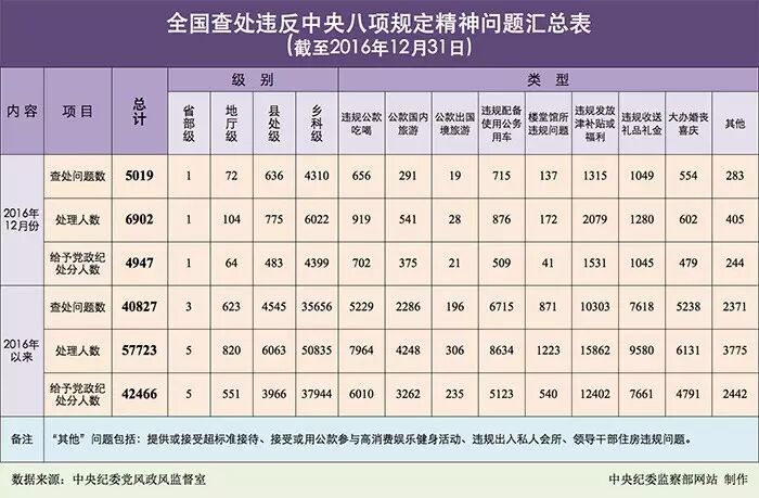 截至12月31日,2016年以来全国查处违反中央八项规定精神问题40827起,处理57723人,给予党政纪处分42466人。