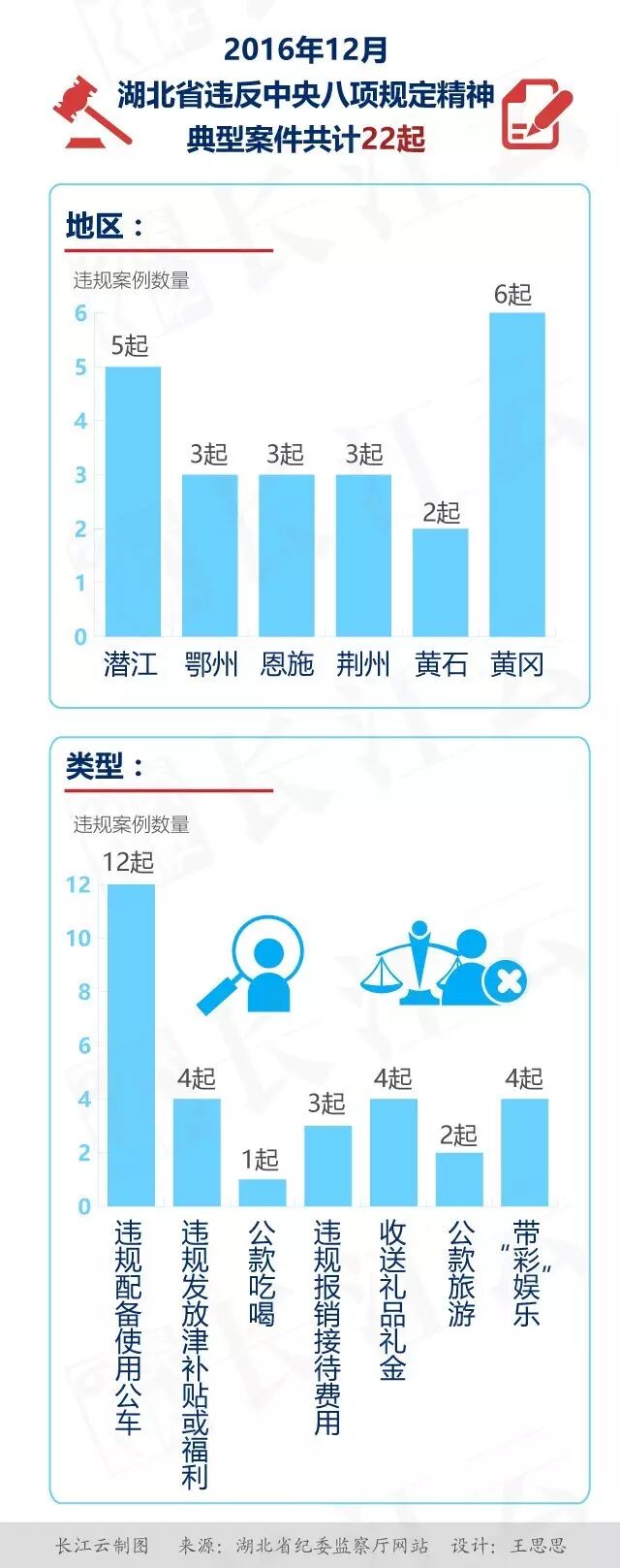 另外,长江云(微信ID:changjiang-y)从网站公开通报中梳理统计,12月份全省违反中央八项规定精神典型案件共计22起,其中潜江5起、鄂州3起、恩施州3起、荆州3起、黄石2起、黄冈6起。