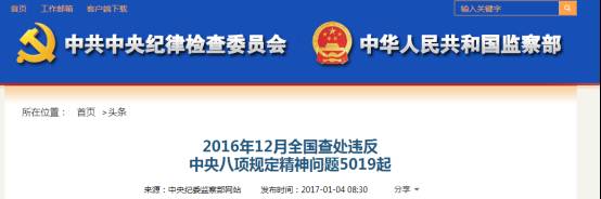 1月4日上午8:30,中纪委网站发出了“2016年12月全国查处违反中央八项规定精神问题”的统计情况。